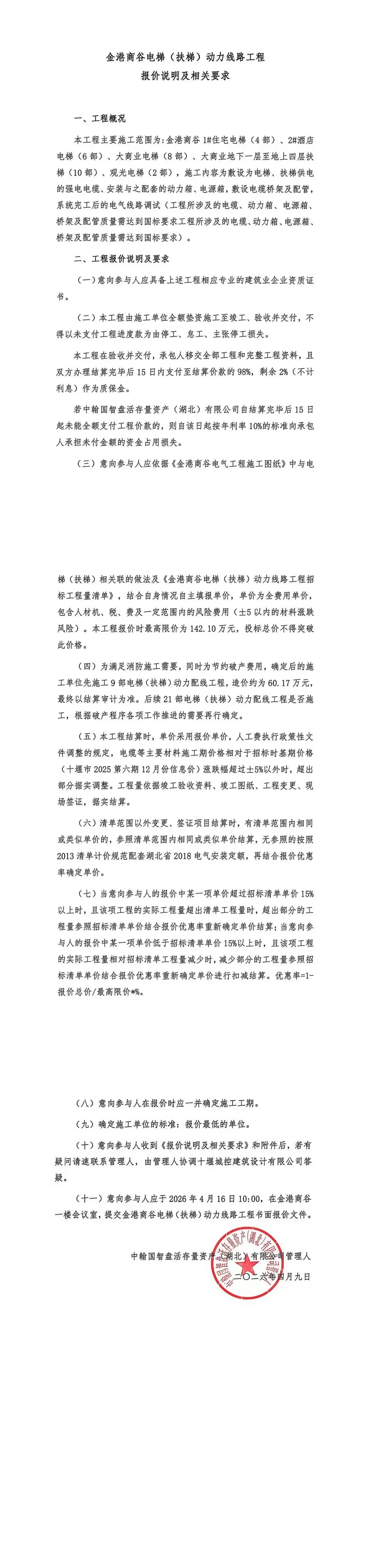金港商谷电梯(扶梯)动力线路工程报价说明及相关要求
