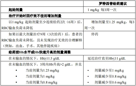 如果患者在以1 mg/kg 起始剂量至少连续给药 2 次(6 周)后未达到 RBC 输血负荷(下文简述为“输血负荷”)降低,则应将剂量增加至 1.25 mg/kg。最大治疗剂量不应超过每 3 周 1.25 mg/kg。