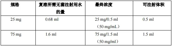 1. 使用上表 2 规定体积的符合药典标准的无菌注射用水注入冻干粉瓶进行复溶。静置 1 分钟。