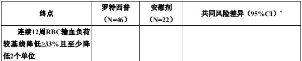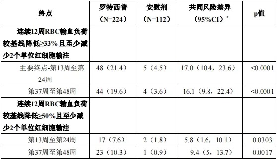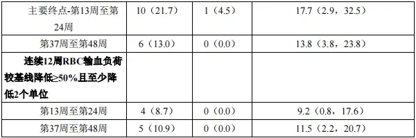基于第13周至第24周实现输血负荷降低(相对基线降低≥33%)且至少降低2个单位的患者比例,对注射用罗特西普在β–地中海贫血成人患者中的有效性进行确证。