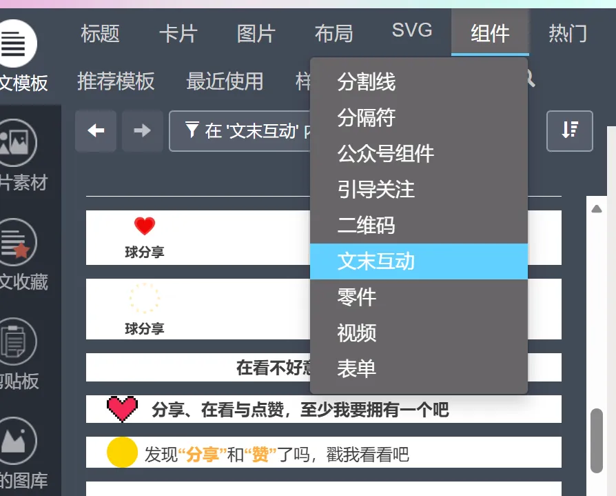 点击最左侧图文模板→组件,就能看见一系列小装饰了,最常见的就是文末互动或者文中分割线,还有那种会动的小装饰,不用再去别的地方找,然后导过来可能还不支持格式,秀米直接加入就行了,方便吧。