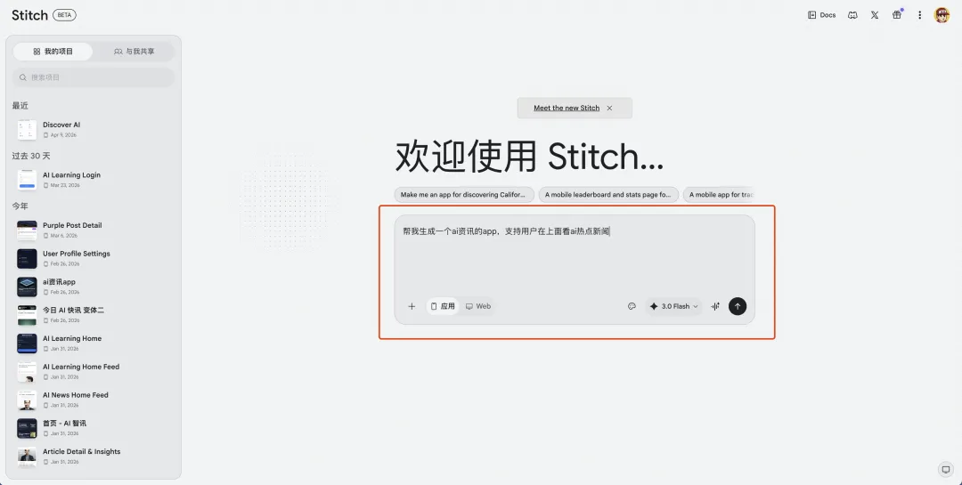 打开 Google Stitch,输入一句话描述你想做什么:
