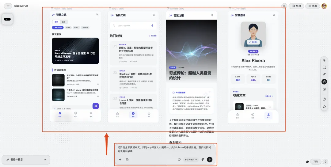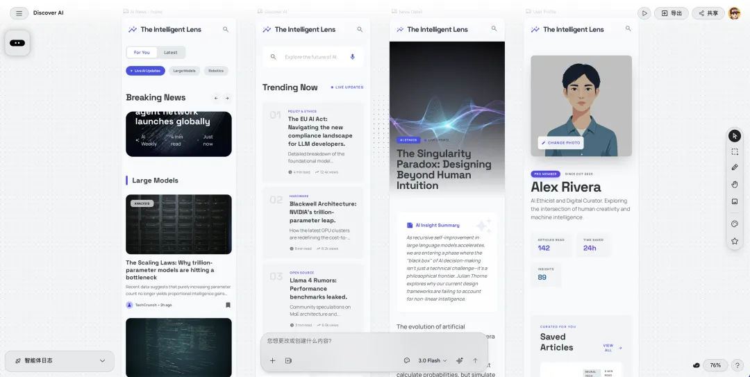 “帮我设计一个 AI 新闻资讯 APP,有首页信息流、收藏夹和用户个人页。”