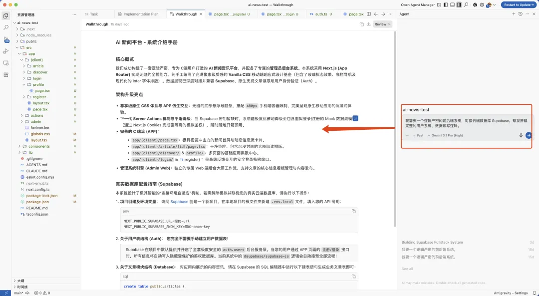 AI 会自动帮你设计数据库表结构,并生成一份”配置手册”,告诉你去 Supabase 复制哪个 API 密钥、粘贴到哪里。你只需要按照指引操作,不需要理解任何背后的逻辑。
