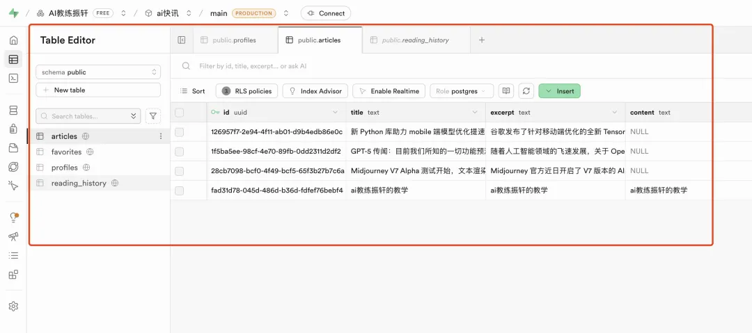 完成之后,你可以在 Supabase 后台看到自动生成的数据库表格:用户表、收藏表、文章表……所有数据都在这里,实时更新。