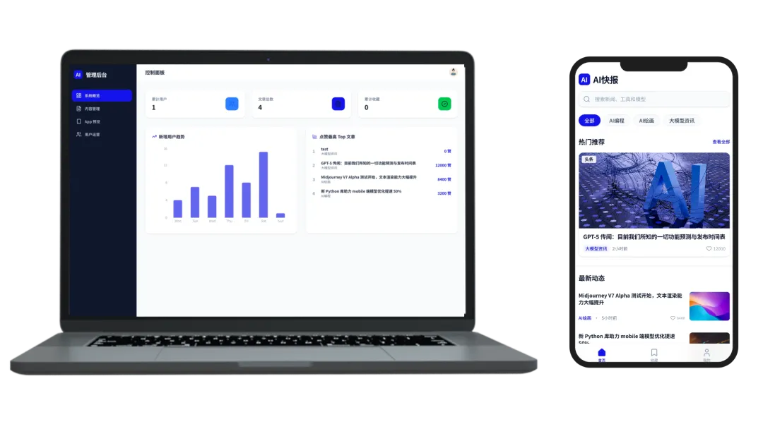 它有用户注册和登录,有点赞收藏,收藏的内容会同步到你的账号,还有一整套配套的管理后台——我作为管理员,在后台输入标题、上传图片、一键发布,APP 那边瞬间同步更新。