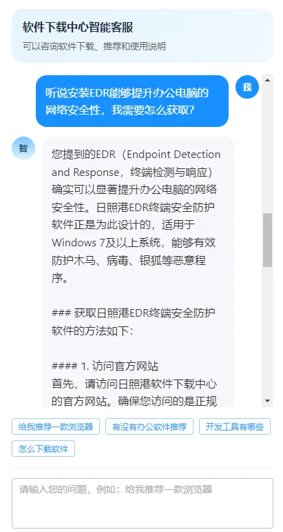 纠结哪款浏览器最适配?搞不懂画图软件怎么选?新手装机一头雾水?别急,智能AI客服来支招!平台创新接入基于大模型技术的智能AI客服,化身商城“百事通”,精准理解你的需求,为你进行“私人订制式”软件推荐,真正做到“懂你所需,推你所想”。