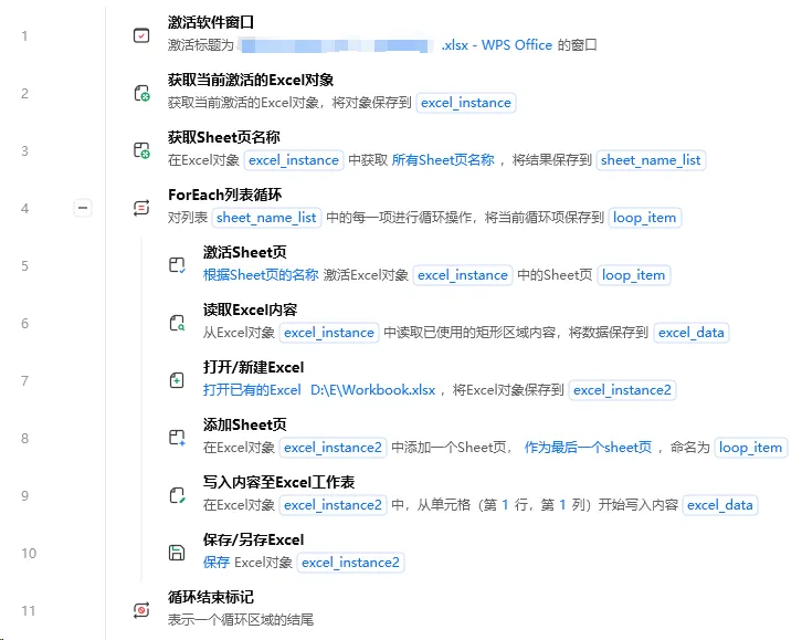 首先使用获取Sheet页名称指令,将WPS表格所有Sheet页名称读取出来并保存为列表。