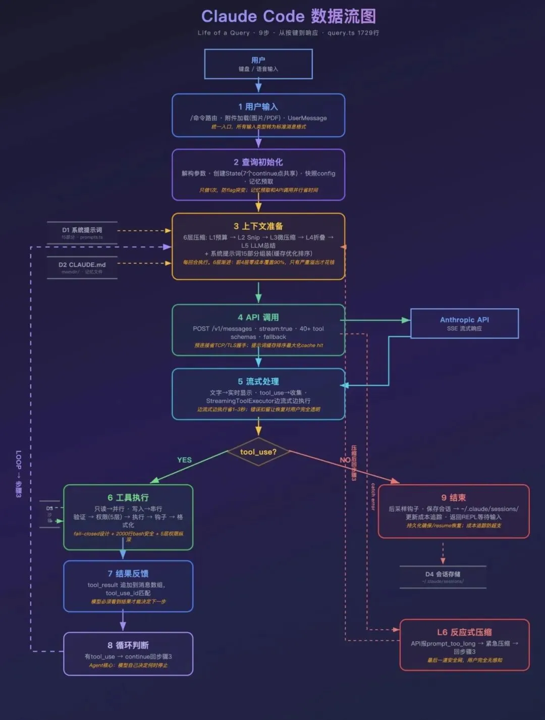 Agent Loop是Claude Code的心脏,核心文件包括QueryEngine.ts、query.ts等,并非简单循环,而是具备7种恢复路径、10种终止条件的隐式状态机,核心设计如下: