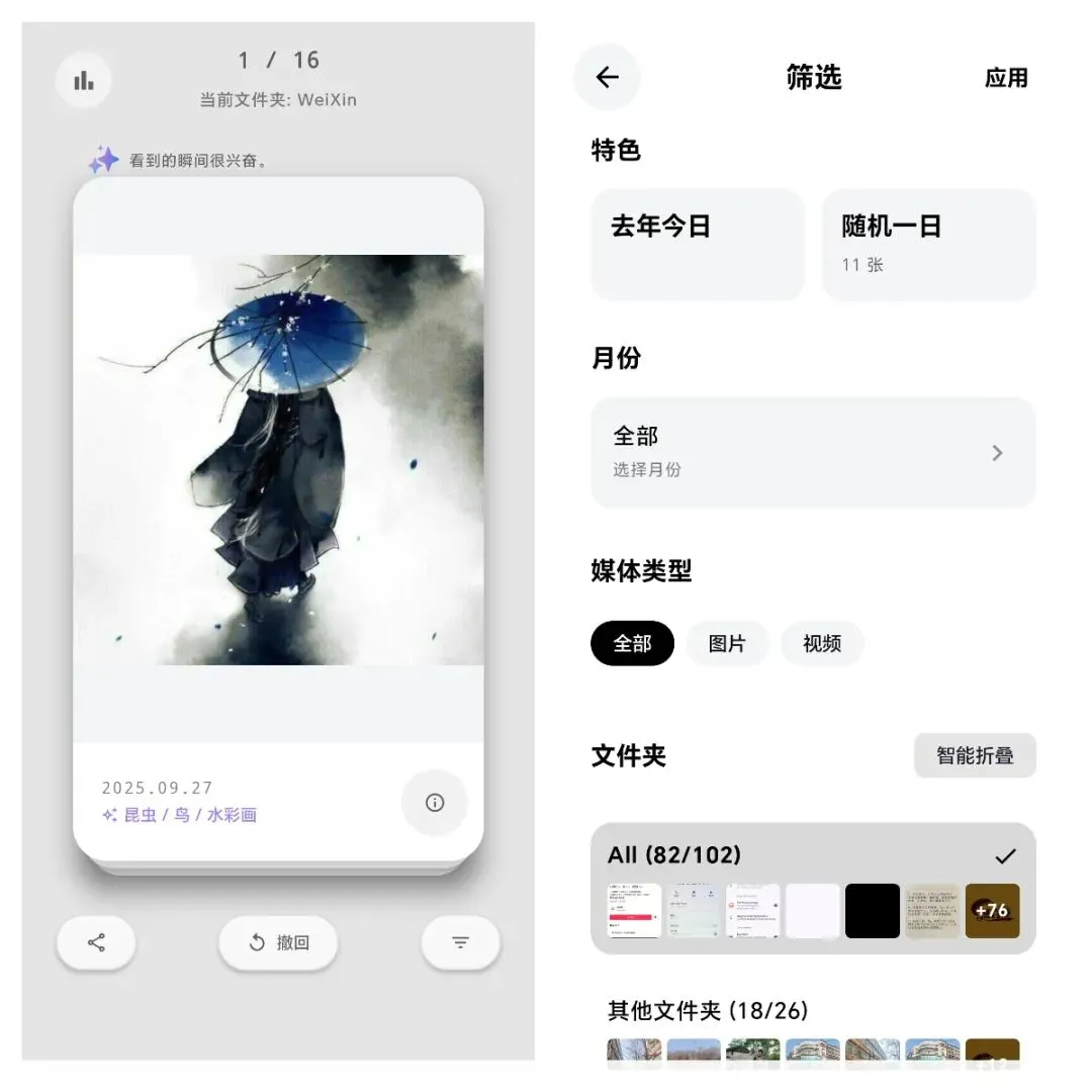 Photoo可以像刷视频一样滑动删选照片并支持撤回,能批量清理重复模糊照片、批量压缩图片视频节省内存空间,还能筛选整理相册、添加水印边框、生成电子相册,自带相册分析功能,每张照片可显示拍摄时间地点和AI识别内容,删除可进回收站30天内可找回,一个软件就能搞定所有照片管理需求。
