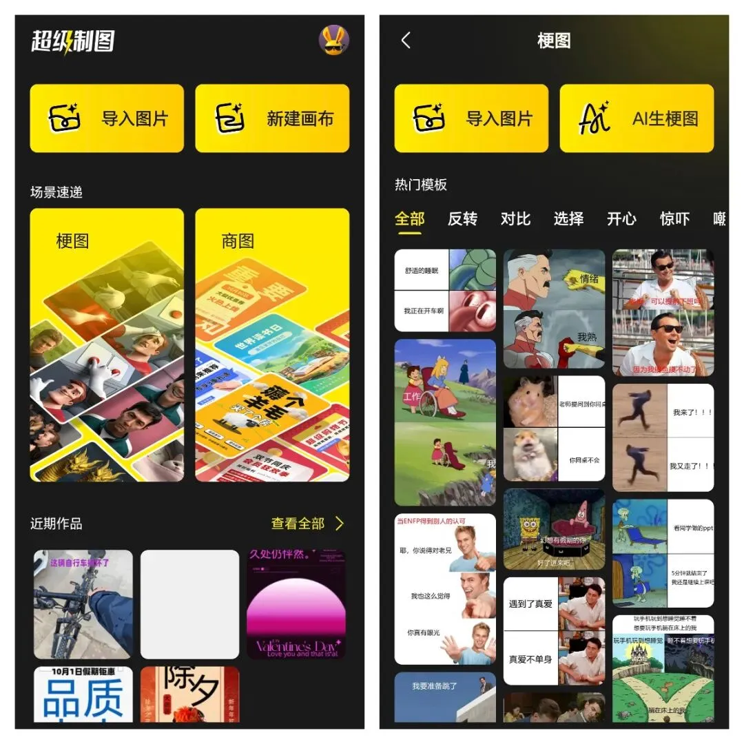 超级制图是一款超实用的手机AI制图工具,内置了海量梗图、商图模板可以直接套用,还可以导入图片或者新建画布制作图片,即使无任何设计基础,也能做出适配各平台的吸睛配图。