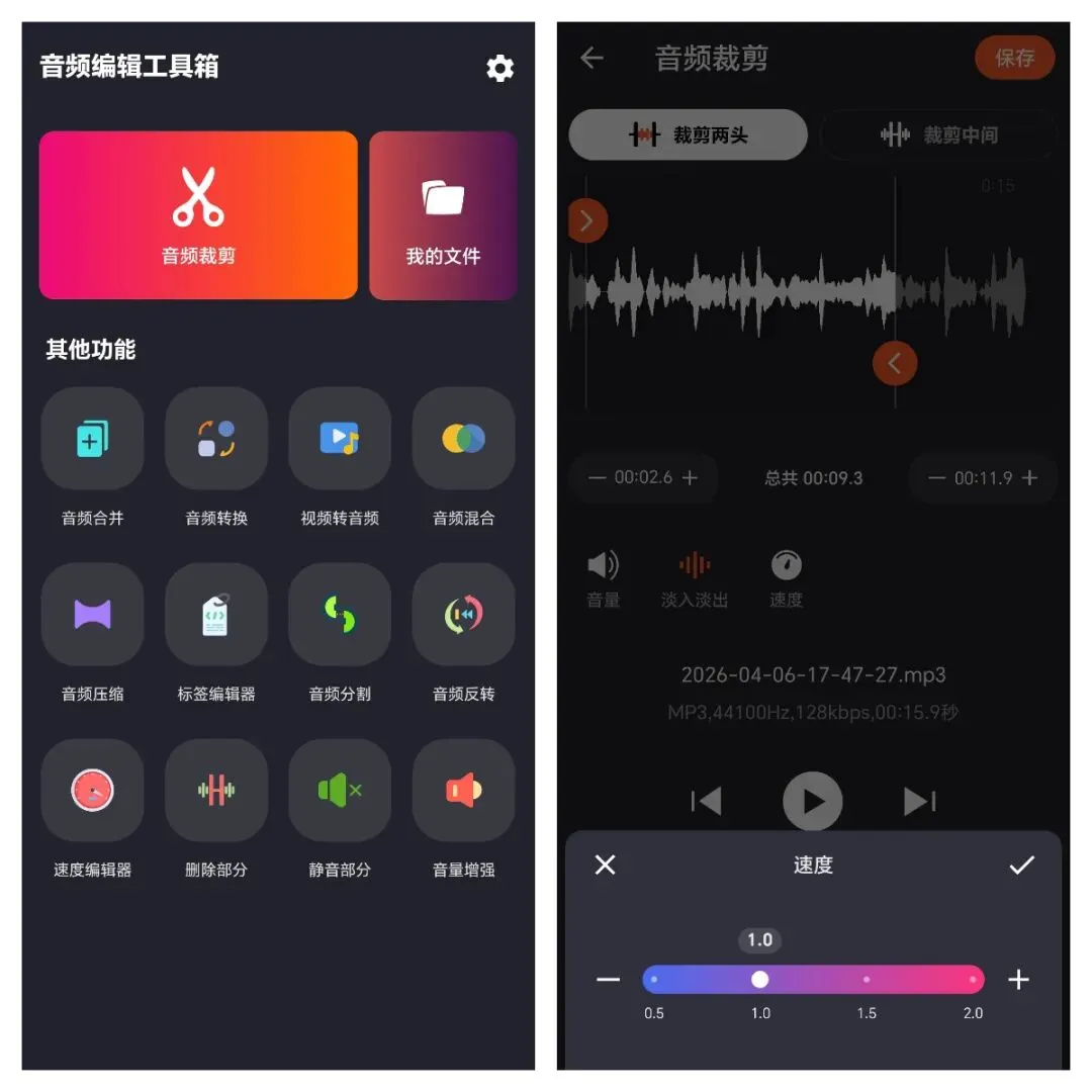 同时这款免费音频编辑工具箱还能调音量、改速度、给音频加淡入淡出效果,压缩音频文件,不管是整理录音、做视频配乐还是调整音频大小,一个app就能全部搞定,用着特别省心。