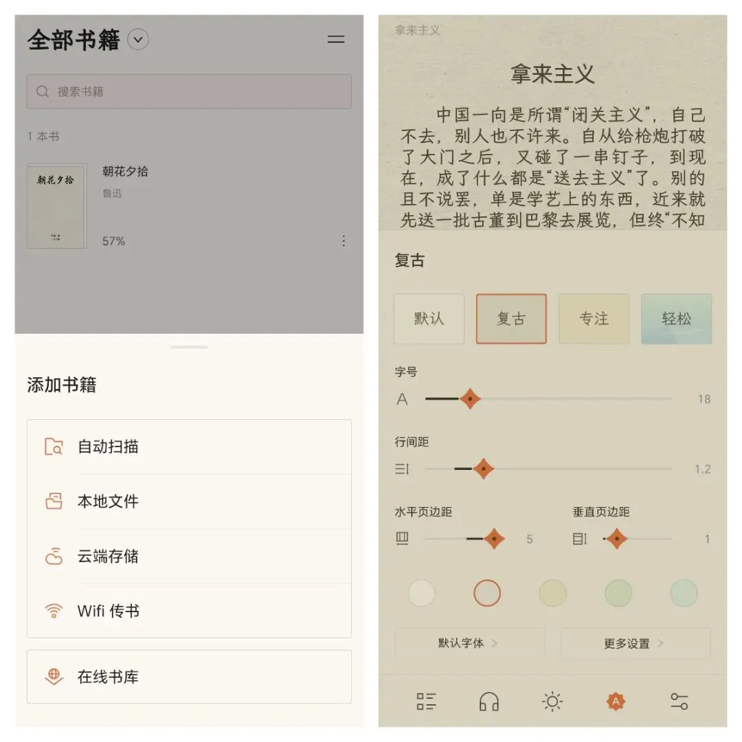 用BooxReader阅读时,可以根据自己的习惯自由调节字体、间距、背景和亮度,软件自带多种阅读主题与夜间护眼模式,支持多种翻页效果、自动阅读和倍速听书,长按文字还能划线标注、添加笔记、翻译查词,同时会统计阅读时长,带来纯粹无干扰的沉浸式阅读体验。