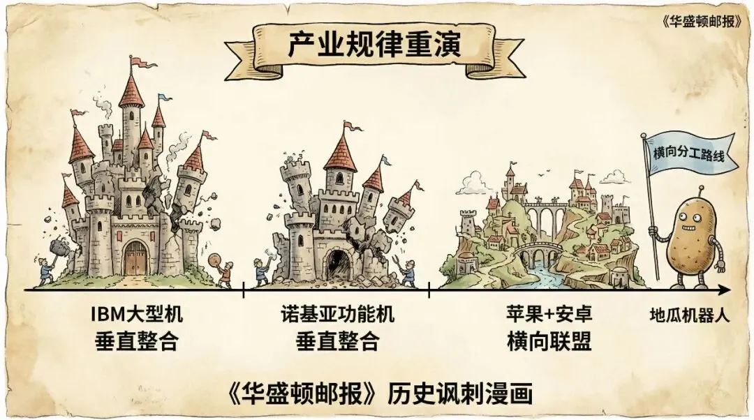 回顾过去半个世纪的产业变迁:IBM垂直整合却败给了Wintel横向联盟;诺基亚的垂直整合在功能机时代无敌,却在智能手机时代被苹果+安卓的横向生态击败。每一次计算平台的迁移,都是从”垂直整合”向”横向分层”演进。