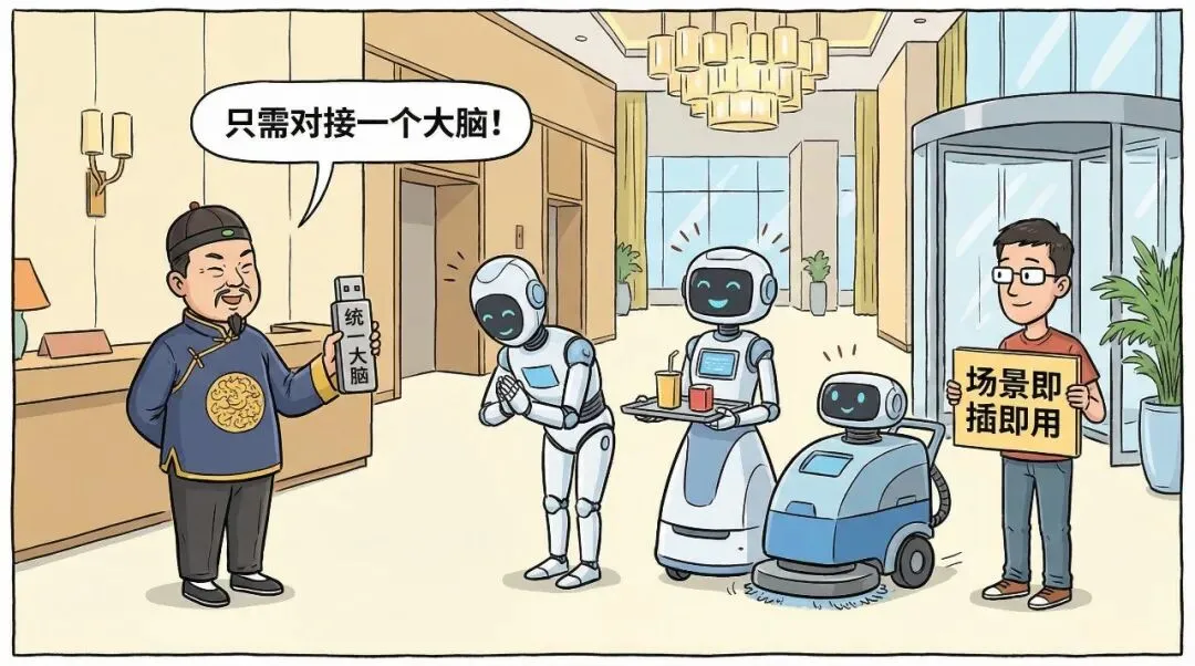 想象一下:一家酒店运营商无需为迎宾机器人、配送机器人、清洁机器人分别采购定制系统,只需对接统一的大脑底座API,即可获得一致的智能服务能力。这种”场景即插即用”将释放出巨大的商业创新空间。