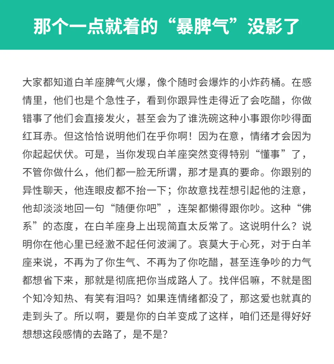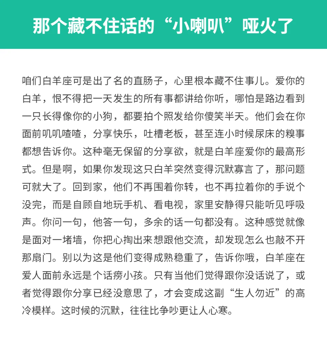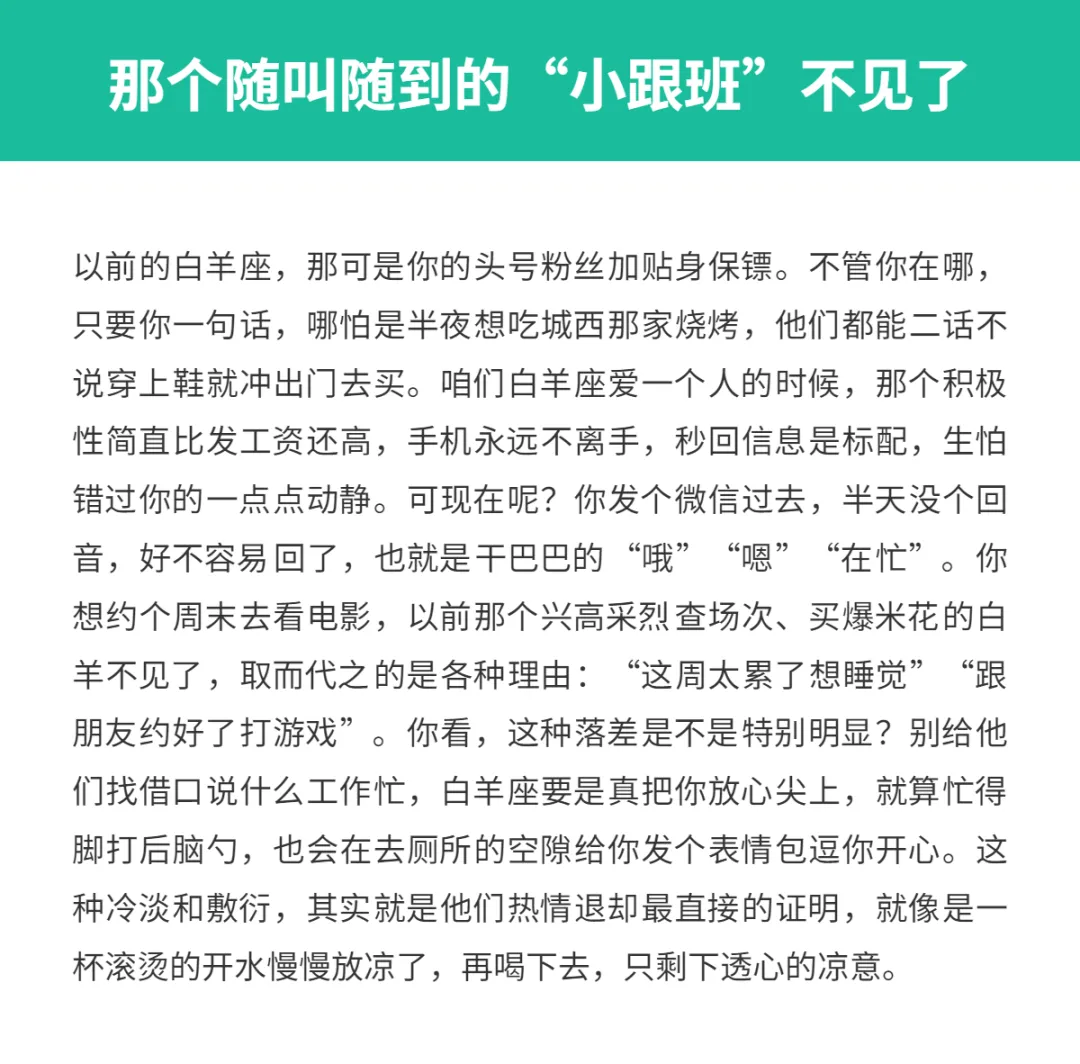 这些点说明白羊座不爱你了! 亲爱的星座朋友,你知道吗? 大家总说白羊座像个永远长不大的孩子, 爱起来像夏天正午的太阳,热烈得让人睁不开眼, 恨不得把心掏出来给你看。 作为一个白羊座,我们的爱从来都是直来直去的, 喜欢就是喜欢,藏都藏不住, 眼神里都带着光,恨不得天天粘着你。 可要是这团火灭了,那变化也是翻天覆地的。 咱们白羊座如果不爱了,那冷淡起来简直像换了个人。 很多时候,你还在纳闷这一向风风火火的白羊怎么突然安静了, 其实啊,这背后的信号早就亮起了红灯。 今天咱们就来聊聊,当白羊座出现这些表现时, 你要心里有点数了,这可能意味着他们的心已经悄悄溜走了。