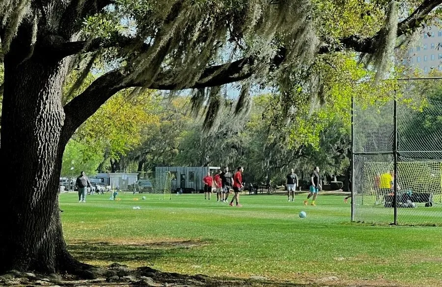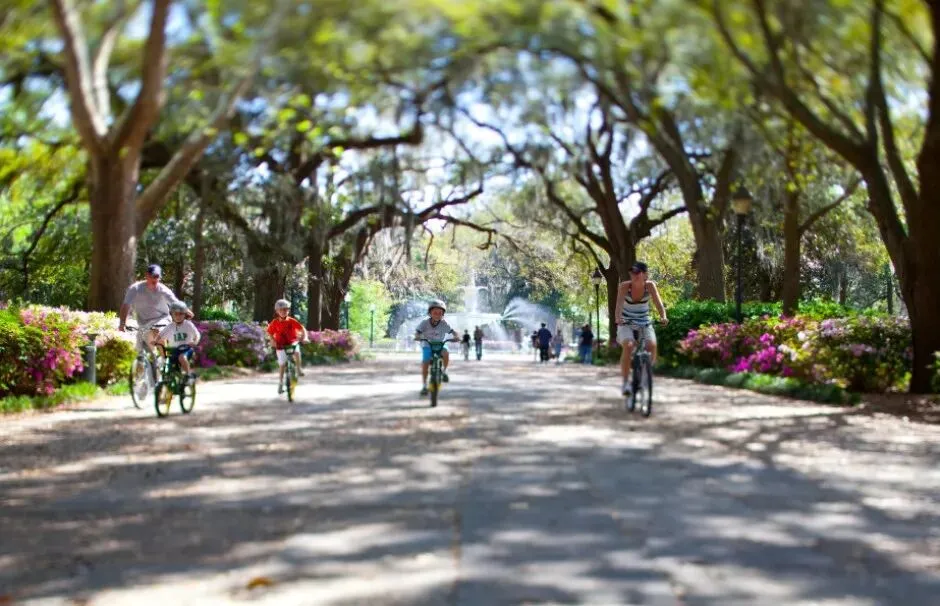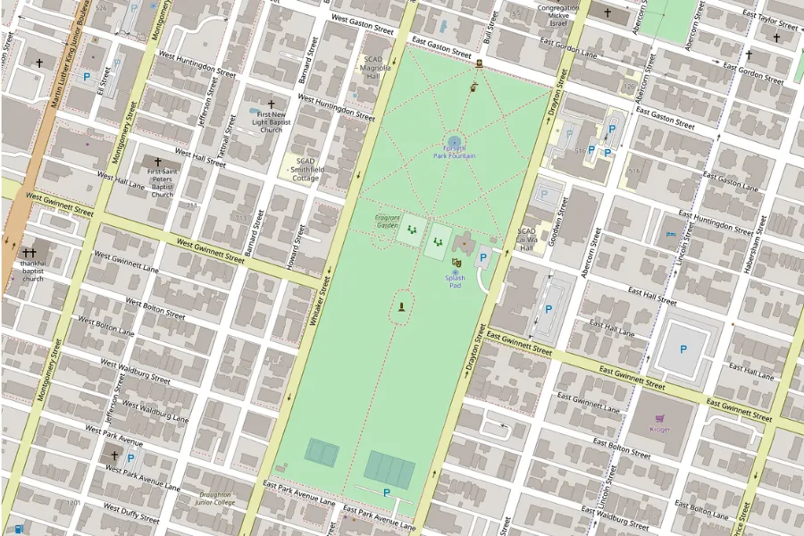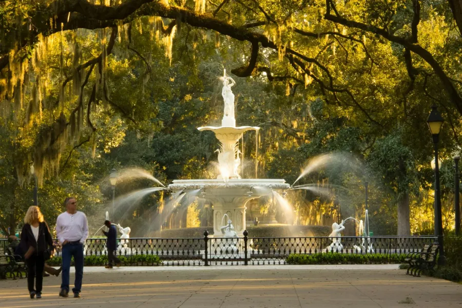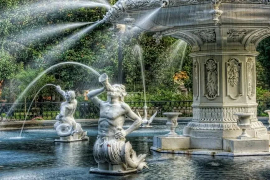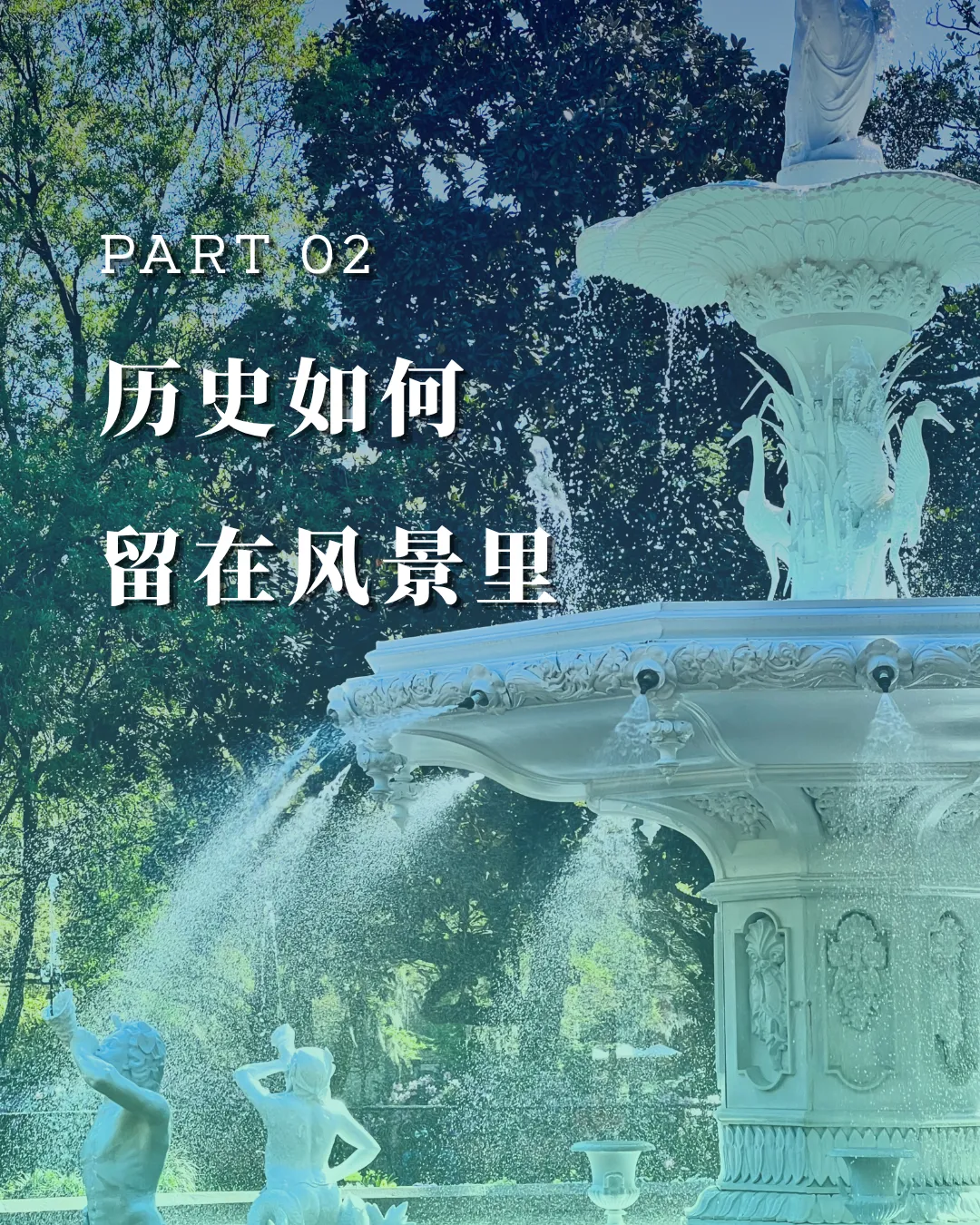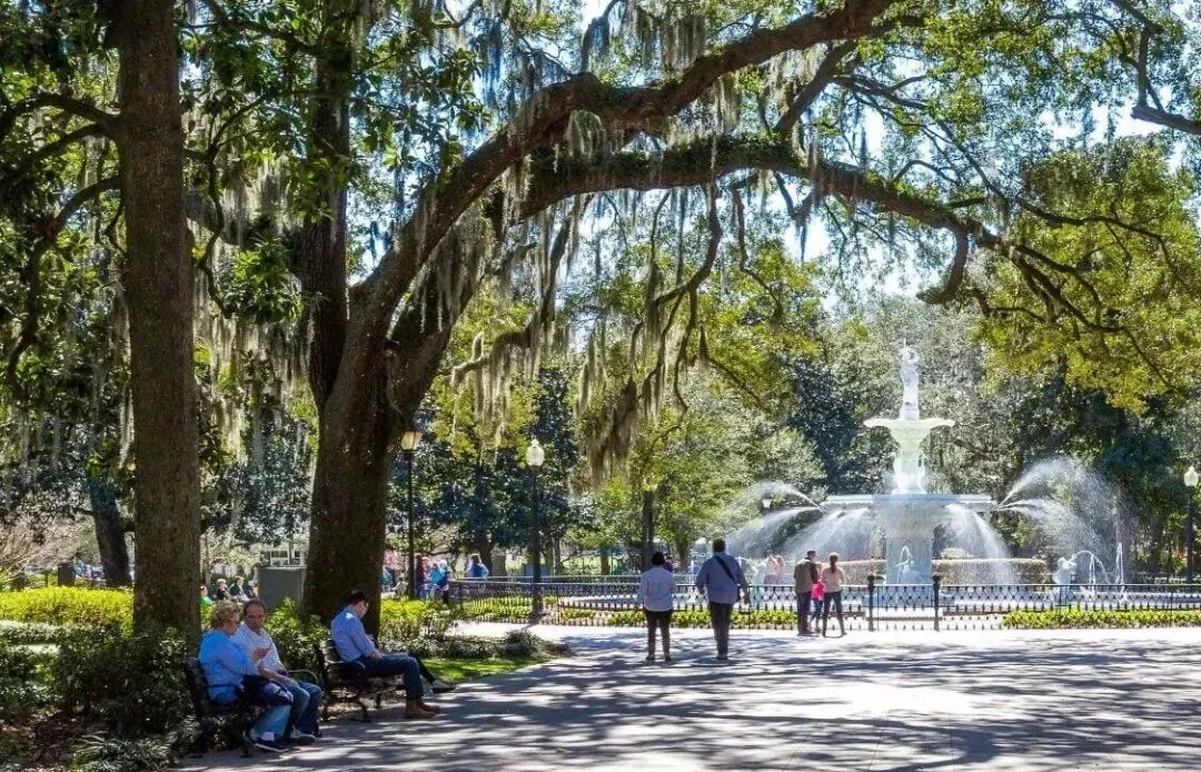 刚搬来萨凡纳时,正好赶上圣诞假期。城市里人不多。所以我对这座小城的第一印象,并不是“海滨城市”该有的明亮与松弛。它位于美国东南海岸,靠近佛罗里达与南卡罗来纳州边界——地理上属于人们印象中阳光、潮湿、带一点度假气息的南方海滨。但真正走进这座城市后,最先感受到的却是另一种气质。冬天的 Spanish moss 从橡树枝头垂落下来,把整条街道罩进阴影里;狭窄而并不规整的道路、成排带有铁艺栏杆和高台阶的老房子,让这里和我熟悉的加州形成了近乎反向的城市印象。它更像美国南方小说里会出现的背景——有些潮湿,有些旧,缓慢得近乎凝滞,连空气里都带着一点历史留下的厚度。而在这样一座城市里,Forsyth Park 像是最能浓缩萨凡纳气质的一块切片。它既是游客镜头里反复出现的地标,也是本地人真正停下来、穿过、坐下、消磨时间的地方。如果说一座城市的街道决定了它如何被穿行,那么一座公园,往往决定了它如何被停留。Forsyth Park 位于 Savannah Historic District 的南端轴线上。从地图上看,它几乎像被刻意嵌入进这座城市的网格之中——规则的街区、连续的住宅界面、笔直延伸的道路,最终都在这里被一片完整的绿色打开。初到萨凡纳时,开车从它旁边经过,我的第一反应其实只是:这座公园比想象中长得多。它不像许多被孤立出来的城市绿地,更像是城市肌理被轻轻掰开后,留出的一道呼吸带。但真正步行进入之后,感受完全不同。Forsyth Park 的特别之处,在于它并不试图制造“脱离城市”的自然幻觉。它始终被住宅、街道与日常生活包围着——你能看见沿街的住宅立面、门廊、车道,也始终意识到自己仍身处城市之中。可与此同时,中央大面积铺开的草坪、成列的步道与轴线式景观,又让这里拥有一种近乎“城市客厅”般的秩序感。某种程度上,它让我想起纽约的 Central Park——不是因为尺度,而是因为那种被城市完整包裹、却又足以改变周边空间气质的中心绿地感。只是 Forsyth Park 更南方,也更克制。它没有 Central Park 的戏剧性边界,而是以一种更缓慢、更日常的方式,嵌入了 Savannah 的生活节奏。与其说它是城市里的公园,不如说它本身就是 Savannah 城市结构的一部分。Forsyth Park 的历史并不以 museum 的方式存在,而是被拆散成 monument / fountain / memorial / ornament,嵌在日常步行路径中.Forsyth Park 的历史并不被封存在展柜或导览词里。它更像被拆解成若干片段,分散留在公园的路径、节点与视线尽头。你走近它们时,先感受到的是景观;再靠近一点,才意识到那是历史。01白色喷泉:被复制出的城市记忆公园北端那座白色喷泉,是 Forsyth Park 最常被拍摄的画面。它建于 1858 年,铸铁材质,设计据说参考巴黎协和广场喷泉原型。某种意义上,它并不“属于” Savannah。它更像 19 世纪美国南方城市对欧洲都市审美的一次移植——