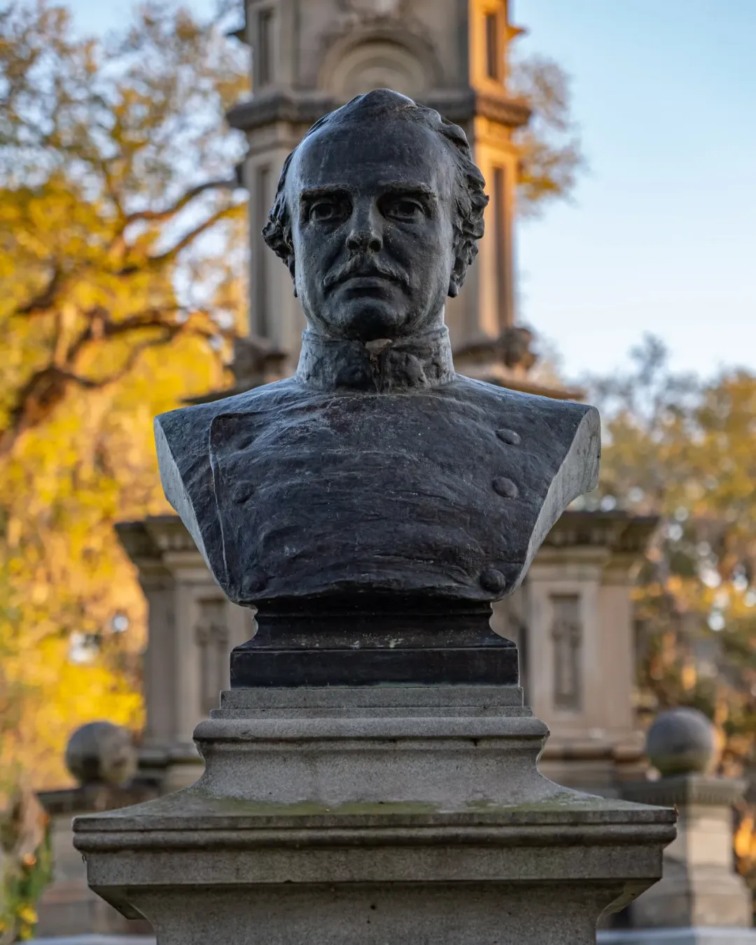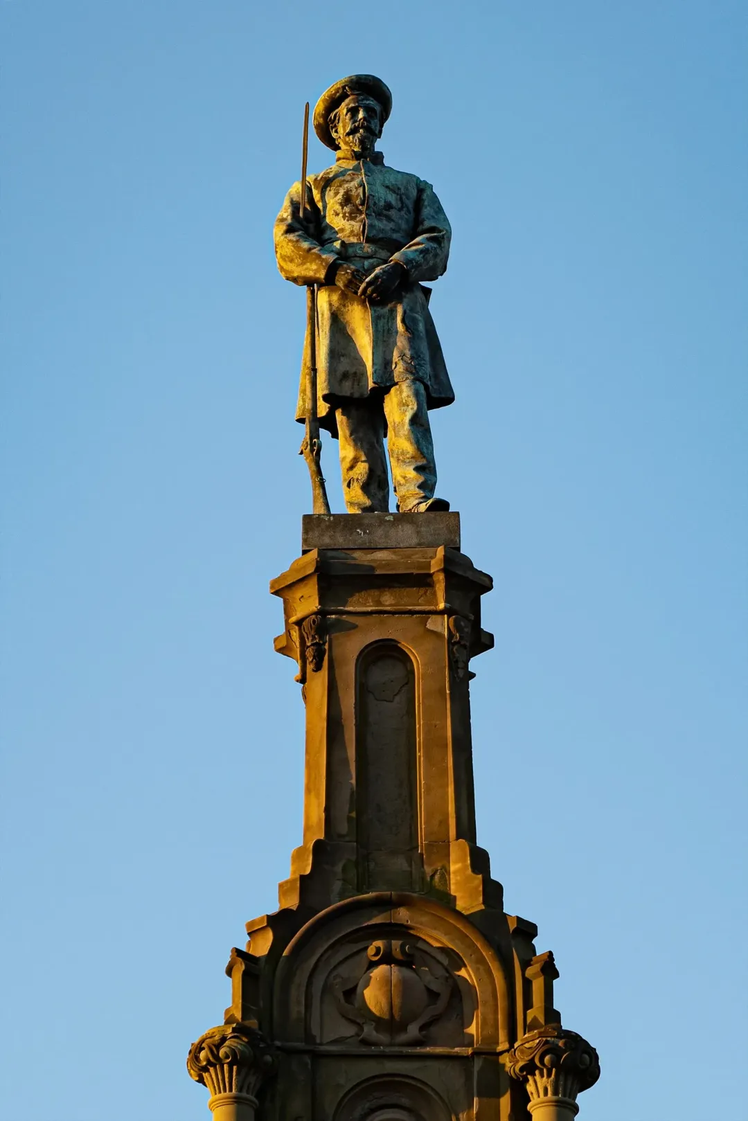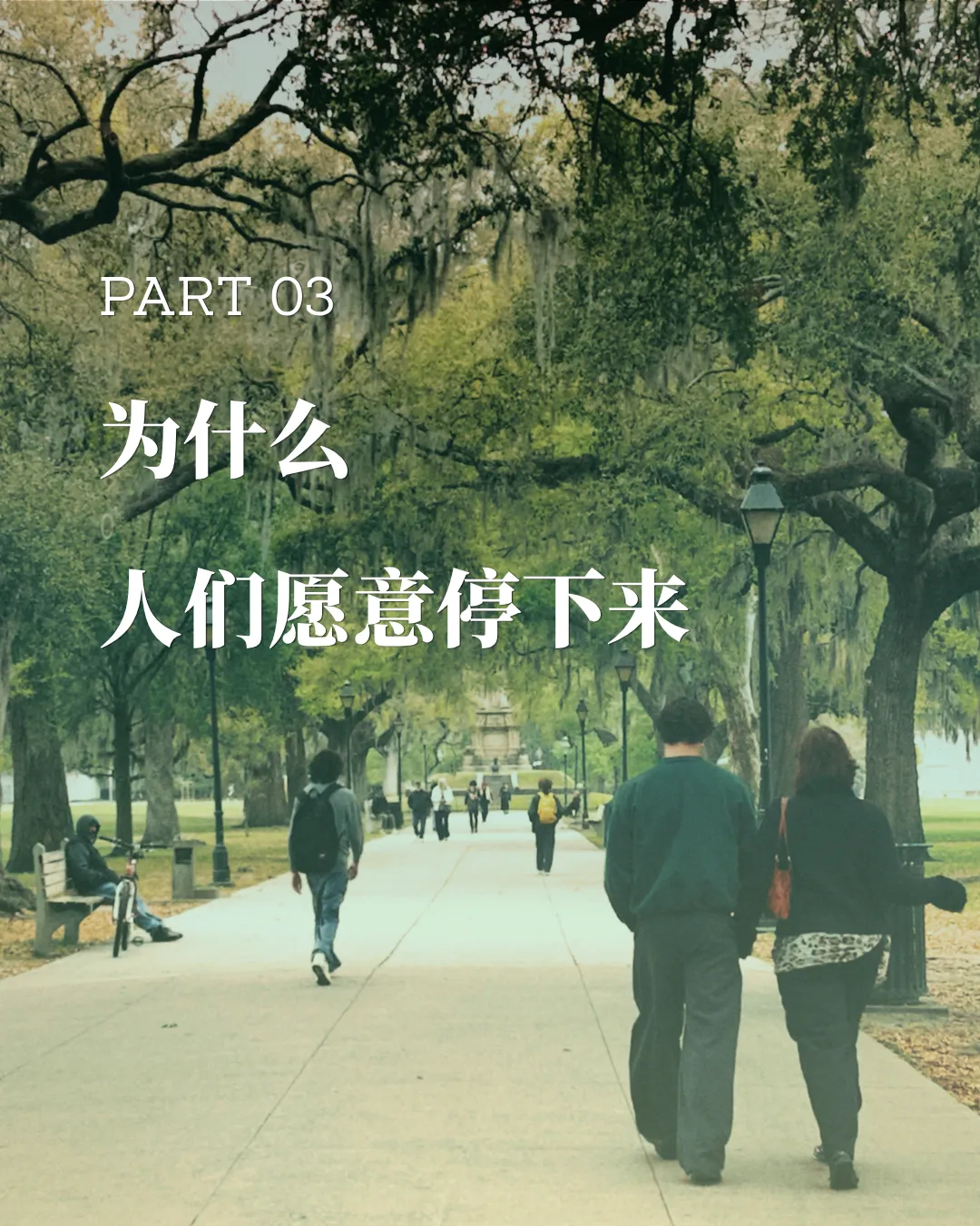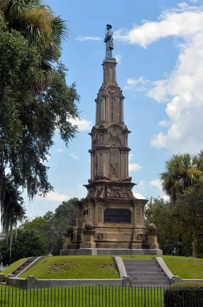 在棉花贸易与港口经济支撑下,当时的 Savannah 正试图将自己塑造成一座足够文明、足够优雅的殖民港口城市。于是,喷泉不只是装饰。它是一种关于城市身份的宣言:这座南方港口希望被看作秩序、财富与品位的象征。今天回看,它早已脱离最初语境,从殖民时代的审美投射,变成 Savannah 最稳定的城市意象之一。02纪念碑:被固定下来的南方旧事公园南端那座高耸的纪念碑,是 Forsyth Park 另一处无法忽视的历史痕迹。它纪念的是 Confederate soldiers——美国南北战争中南方邦联一方的士兵。连同基座上的人物头像与铭文,共同构成了一整套关于南方记忆的纪念叙事。纪念碑于 1875 年揭幕,属于佐治亚州现存最早、也最具代表性的南方邦联纪念物之一。顶部最初并非今天的士兵铜像,而是一组寓意性雕塑,直到 1879 年才更换为现在的形象。前后两座人物头像则是后来加入的补充。它们分别纪念 Francis S. Bartow 与 Lafayette McLaws——两位与 Savannah 南方邦联历史密切相关的人物。原本位于 Chippewa Square 的青铜头像于 1910 年迁至此处,被纳入纪念碑整体叙事之中。Bartow 出生于 Savannah,在第一次马纳萨斯战役中阵亡,长期被塑造成本地战争英雄;McLaws 则是南方邦联将领,其纪念塑像由本地退伍军人组织推动设立。于是,这座纪念碑的意义便不止于“纪念战争”。它更像是战后数十年间,Savannah 对自身历史的一次主动整理与空间书写——选择纪念谁、如何纪念、又将纪念放在城市最重要的公共空间之一。它至今仍立于 Forsyth Park 的轴线尽端,某种程度上也提醒着人们:历史从未真正退出风景。它只是以被景观化的方式,继续存在。03士兵雕塑:树荫下的另一场历史回声而在公园更南侧,还有一座不能被忽略的士兵雕像。它名为 The Georgia Volunteer,本地人更常直接称它为 The Hiker。纪念的是 19 世纪末参与美西战争及后续海外战争的佐治亚志愿兵——Savannah 因当时贡献士兵比例居全州前列,而成为这座纪念像的设立地点。与前一代纪念碑相比,它的气质明显不同。如果说南军纪念碑仍属于战后南方对“失落事业”的庄严悼念,那么这位背枪前行的士兵,则已经进入了美国迈向海外扩张时代的国家叙事。从 Civil War 到 Spanish-American War,Forsyth Park 里的纪念物几乎串联起了 Savannah 对不同时代战争记忆的选择性保留。它们并不集中在博物馆里,而是散落在树荫、步道和草坪之间,成为人们遛狗、慢跑、野餐时会经过、却未必停下来细看的背景。历史并没有被封存。它只是被放进了日常生活里。很多城市都有公园,但并不是每一片绿地都能真正让人停下来。有些公园更像“看起来该存在”的城市配套——被拍照、被经过、被地图标注,却很少真正被使用。Forsyth Park 的不同在于,它并不只是一块被保留下来的绿地。它更像 Savannah 日常生活主动流经的一部分。清晨有人沿着步道跑步、遛狗、骑车;午后有人坐在树荫下看书、聊天、野餐;周末的草坪会被瑜伽课、市集和临时活动占满。它既允许穿行,也鼓励停留。这或许与它的空间结构有关。中央开阔的草坪提供了足够明确的活动场地,四周被成排树荫、步道和座椅包裹,既有开放感,也保留了边界感与停留的舒适度。而更重要的是,它并没有像许多大型城市公园那样,被刻意从城市中“切割”出来。住宅、街道、咖啡馆与日常生活直接贴着公园边缘展开,人们不是“专门去公园”,而是在经过城市的过程中自然进入公园。于是 Forsyth Park 最特别的地方,或许并不在于它有多壮观。而在于它证明了一件事:真正好的公共空间,不是让人来看。而是让人愿意留下。