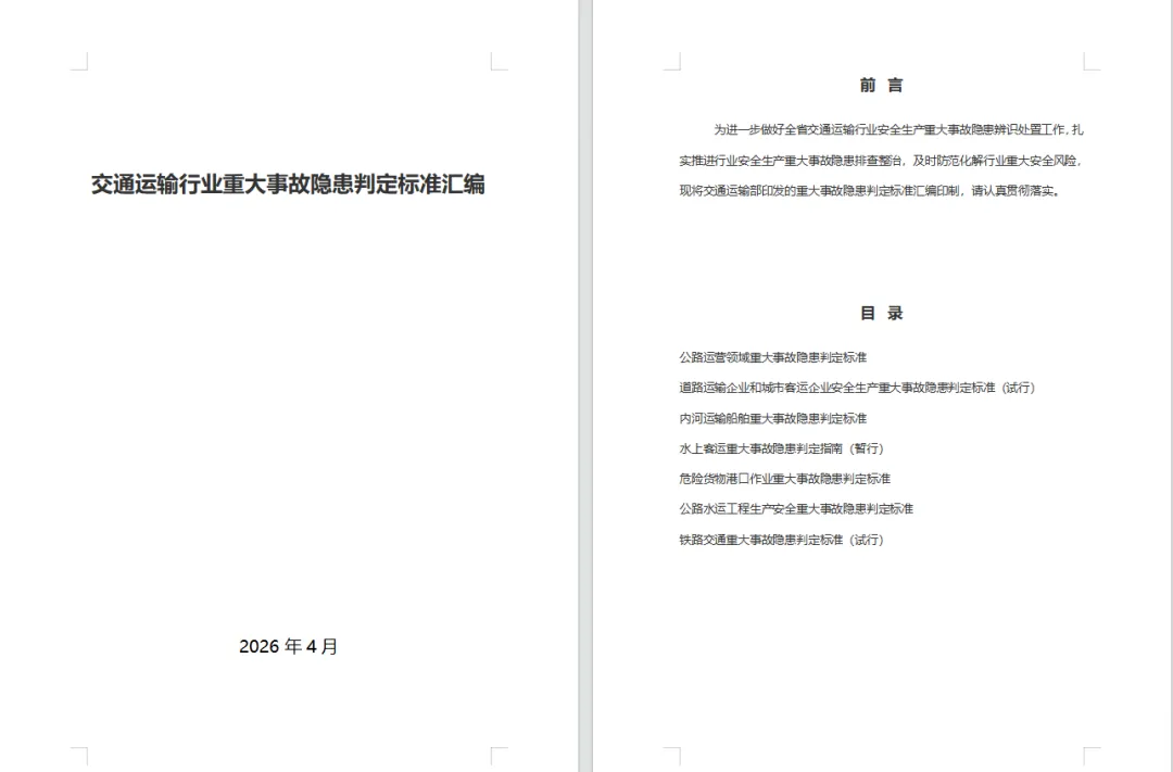 免费下载!《交通运输行业重大事故隐患判定标准汇编》(32页)