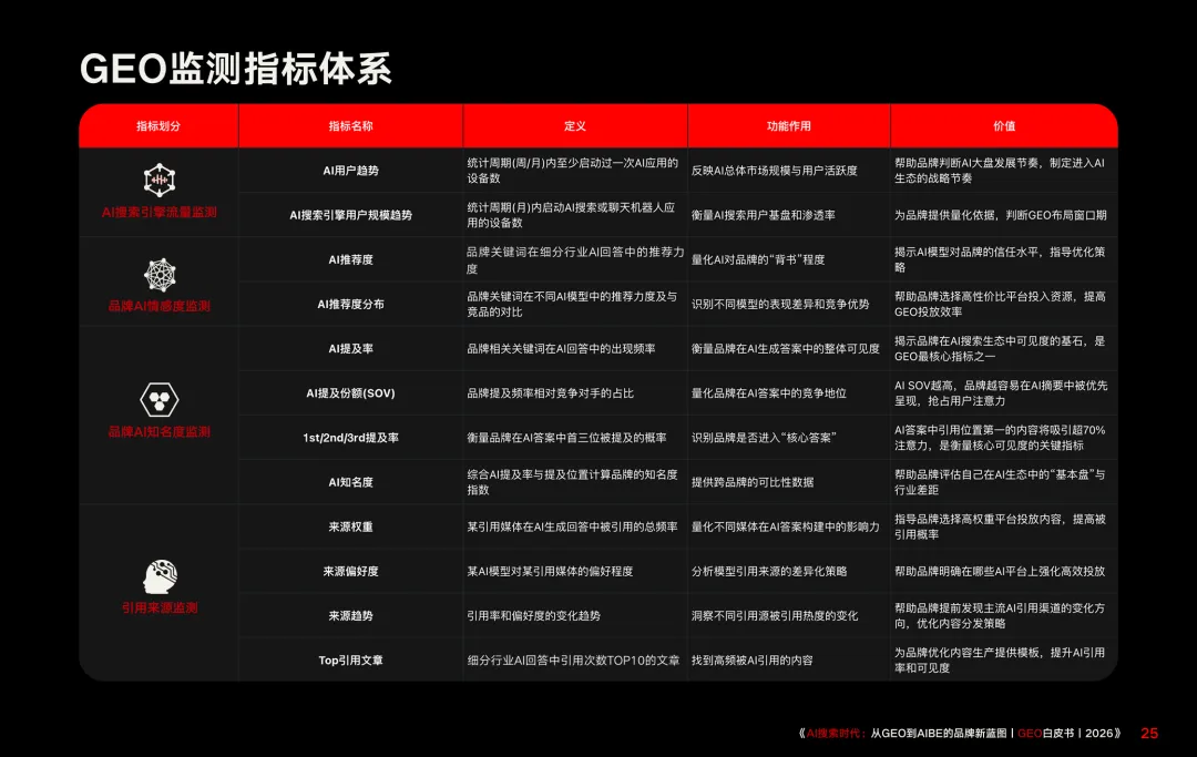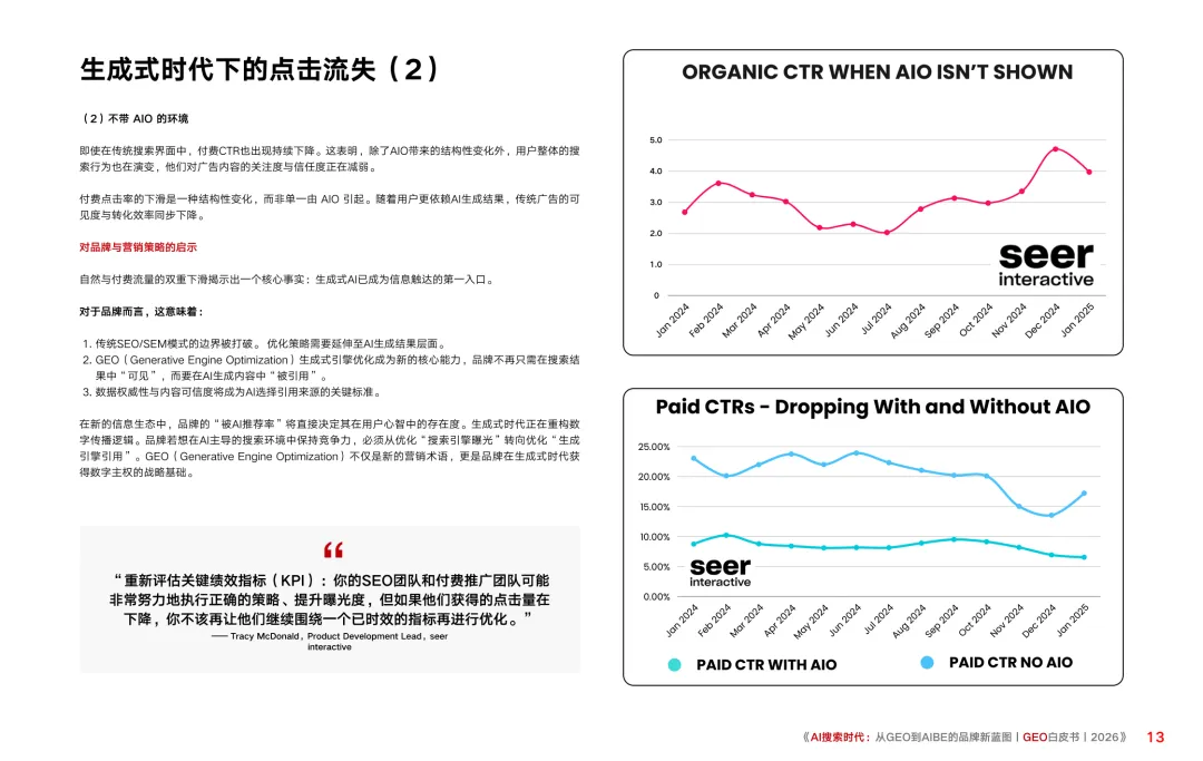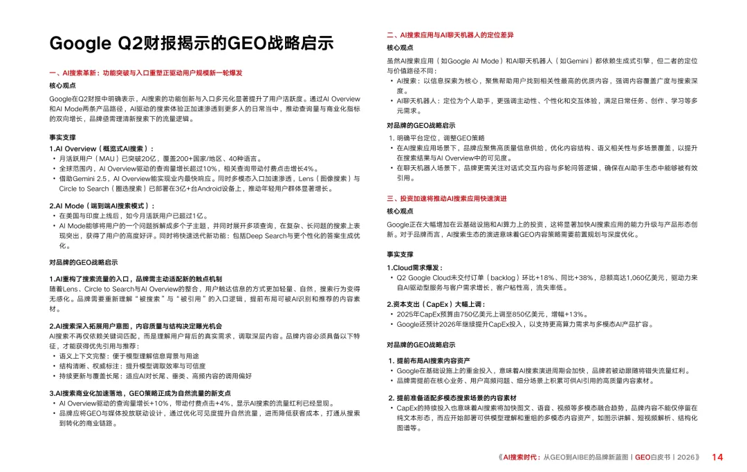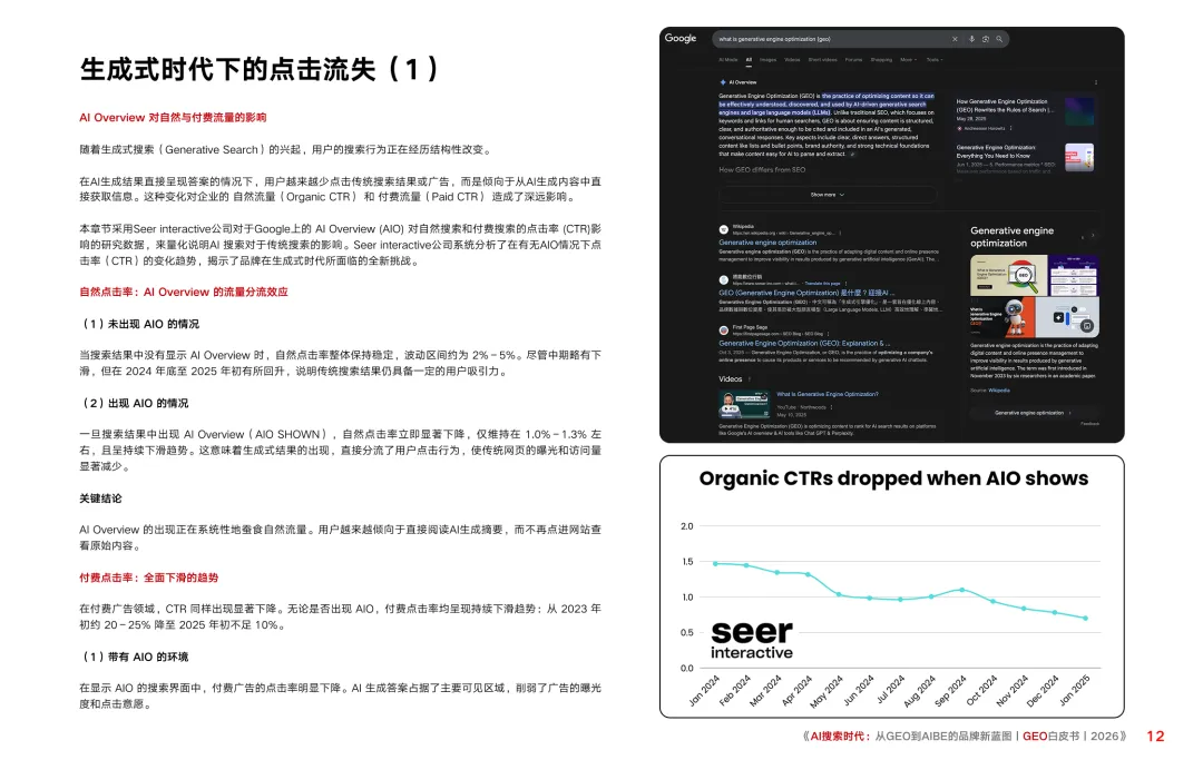 报告指出,AI 搜索全面崛起,用户从 “搜链接” 变为 “要答案”,传统 SEO 首页排名价值锐减,Google AI Overview 使自然点击率下滑超 70%。GEO(生成式引擎优化)成为品牌必备能力,核心是让内容被 AI 理解、信任与引用,从 “被发现” 升级为 “被信赖”,这与聚焦排名的 SEO 有着本质区别。