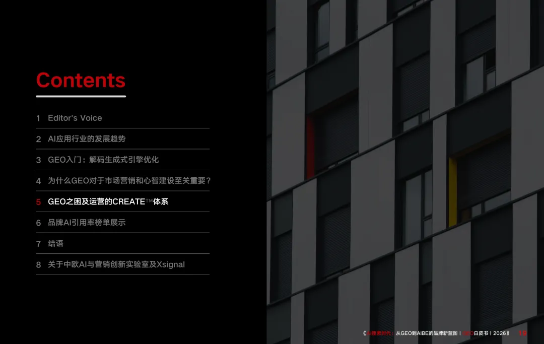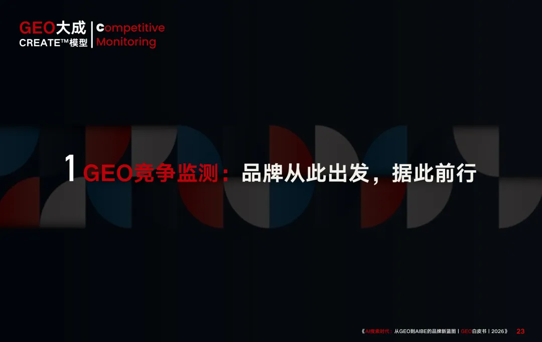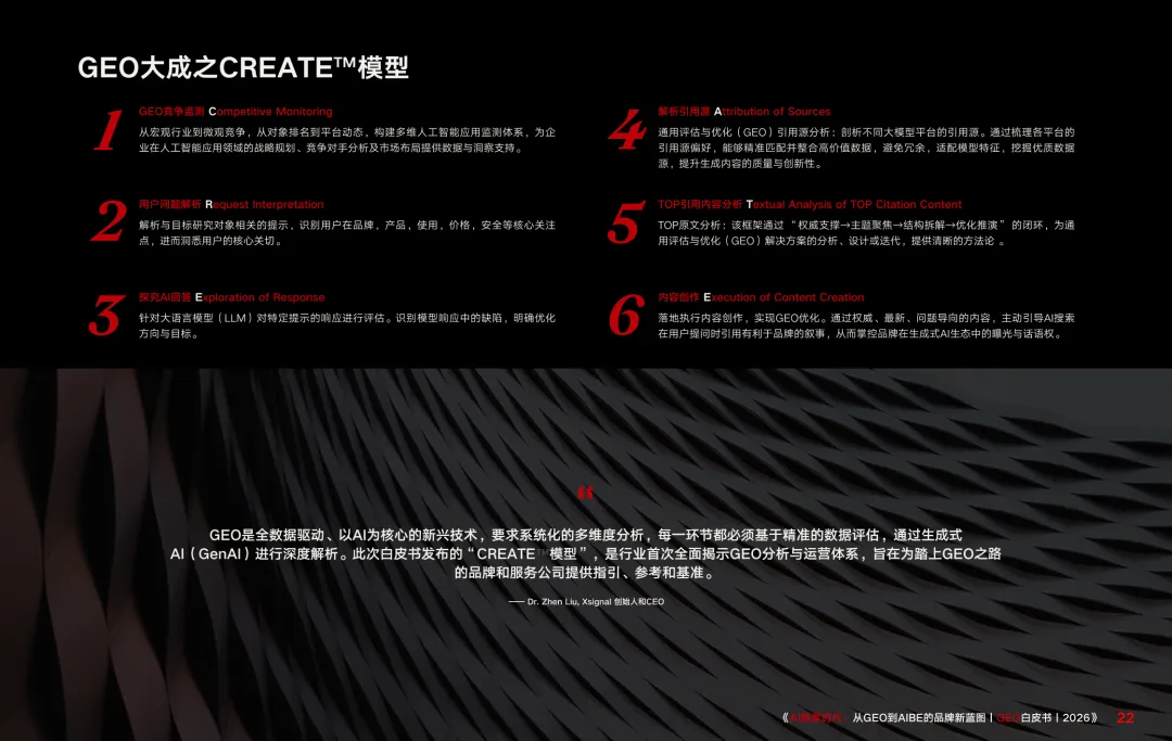 同时,白皮书提出 AIBE(AI 品牌资产)框架,构建品牌在 AI 环境下从可识别性到心智显著性的资产体系。面对语境随机、生成波动、数据源迭代等 GEO 运营难题,报告推出 **CREATE™** 体系,涵盖竞争监测、引用源解析、用户问题解读等全流程,为品牌提供可落地的实操路径。