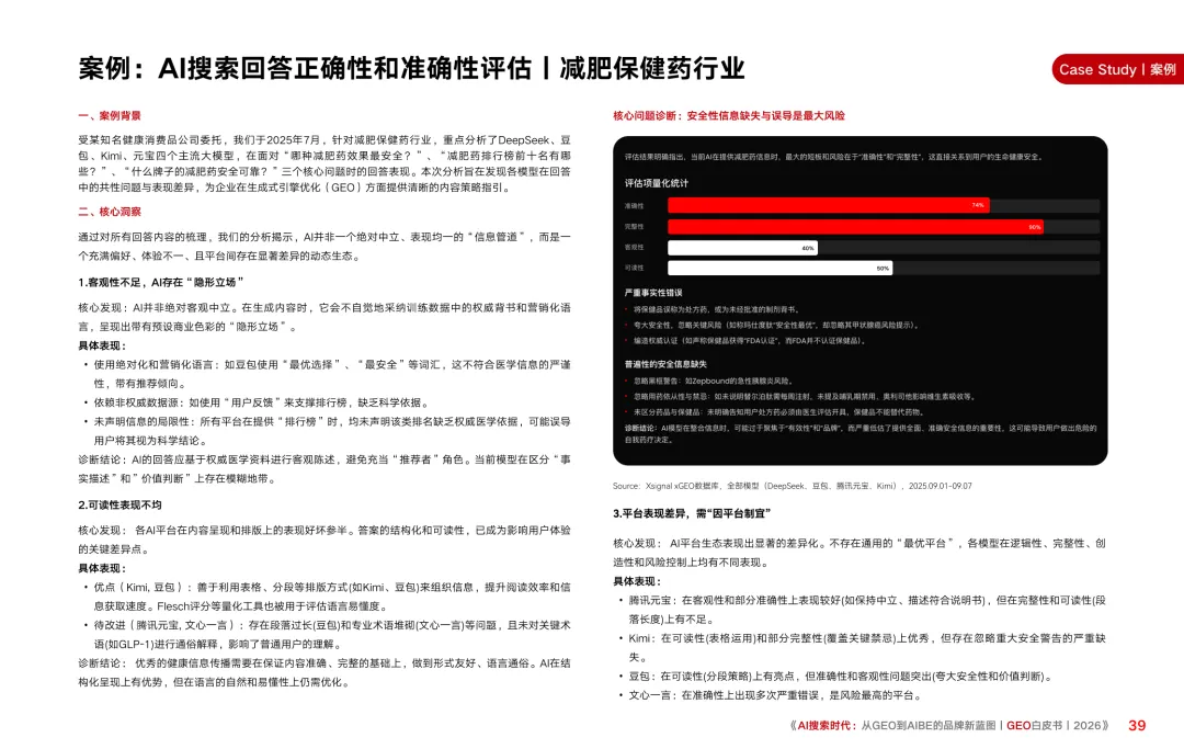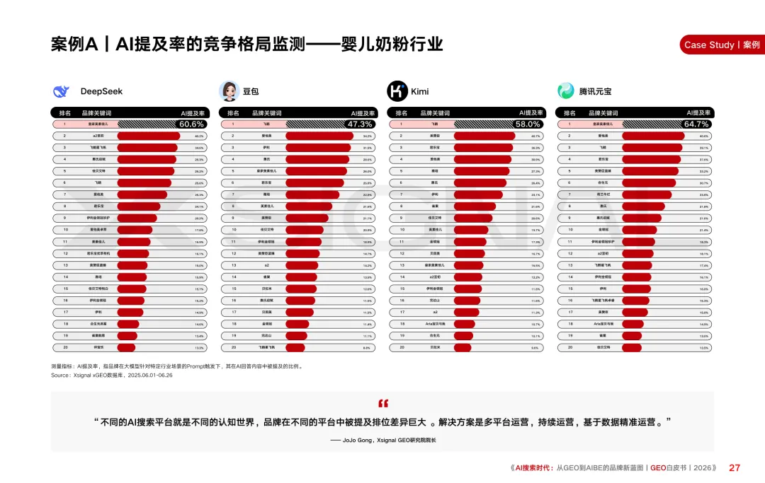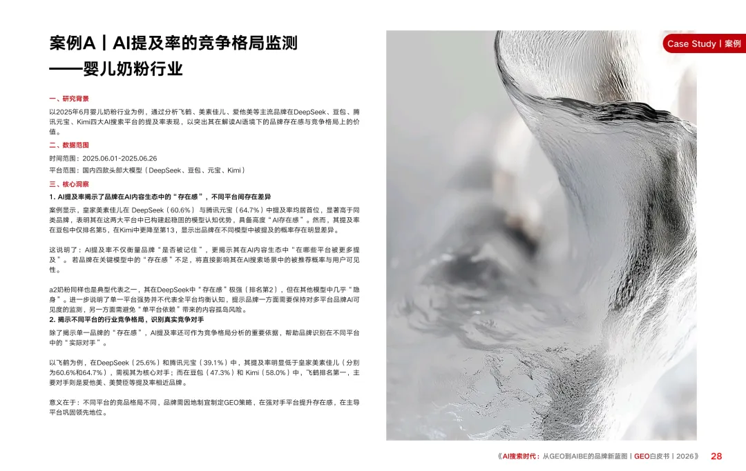 此外,报告通过多行业 AI 引用率榜单、真实案例,揭示品牌在不同 AI 平台的曝光差异,强调提前布局 GEO 可抢占 AI 推荐红利,掌控品牌叙事权,最终实现心智占领与转化增效。