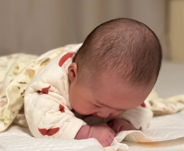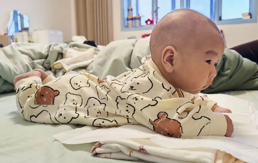 满月前后:趴着的时候能把头从床面上微微抬起一点点,哪怕只有一两秒,脸颊刚刚离开床面,就算合格。这时候颈部肌肉刚刚开始工作,别要求太高。