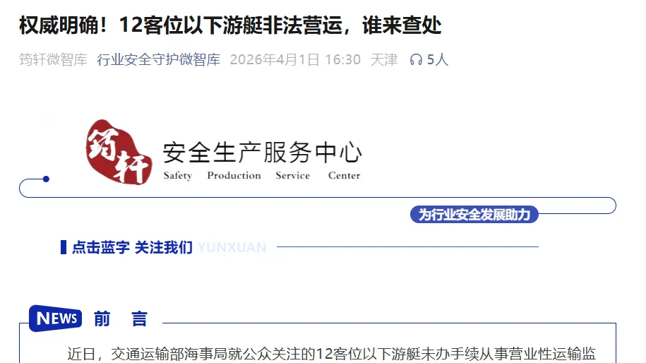 近日,有个很权威的安全智库公众号发了篇文章,权威明确!12客位以下游艇非法营运,谁来查处大概意思是,很多人在质疑游艇用于运营,游艇客座少于12个用于运营,这种不安全的情况应该谁来管,似乎游艇用于运营是非常危险,对公众安全构成很大威胁,很多人质问应该要有机构来管游艇用于运营这个事,内容阐述终于看到海事部门的权威解说,似乎游艇运营这个事海事终于进行说明,游艇运营是不允许的,终于有监管部门来明确监管游艇运营这种不安全行为,从标题和内容可以感觉该智库那种强烈的社会责任心,为安全守护的强烈愿望,认为游艇运营已经超越安全底线,可以感受到该智库的良苦用心。