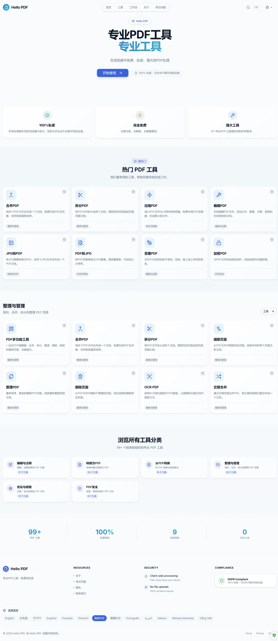 打开 hello-pdf.com 首页,功能一目了然,覆盖了日常最常用的PDF处理场景: