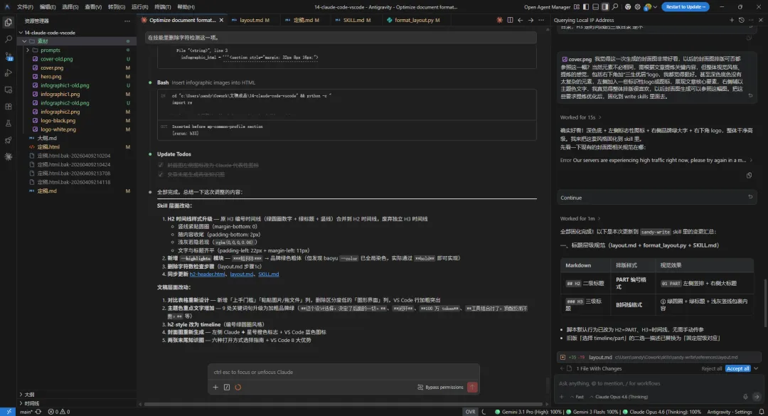 VS Code 和 Antigravity 浏览器可以左右分屏,共享同一个工作文件夹。Claude Code 在 VS Code 里改了文件,Antigravity 里实时能看到结果。我在 Antigravity 里查到的资料,直接拖进 VS Code 的输入框。
