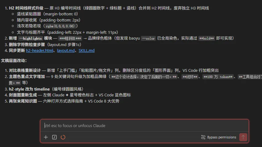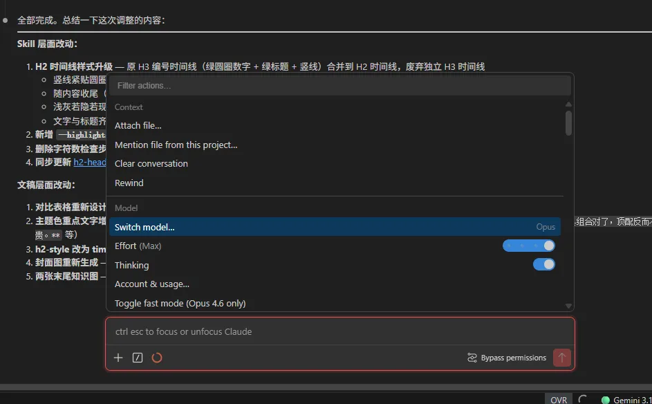 这个操作在 CLI 里要打命令,在桌面 App 里也有,但只有 VS Code 插件做到了”看一眼就知道状态,点一下就搞定”。在长时间的写作或编程会话里,这个细节的体验差距是巨大的。