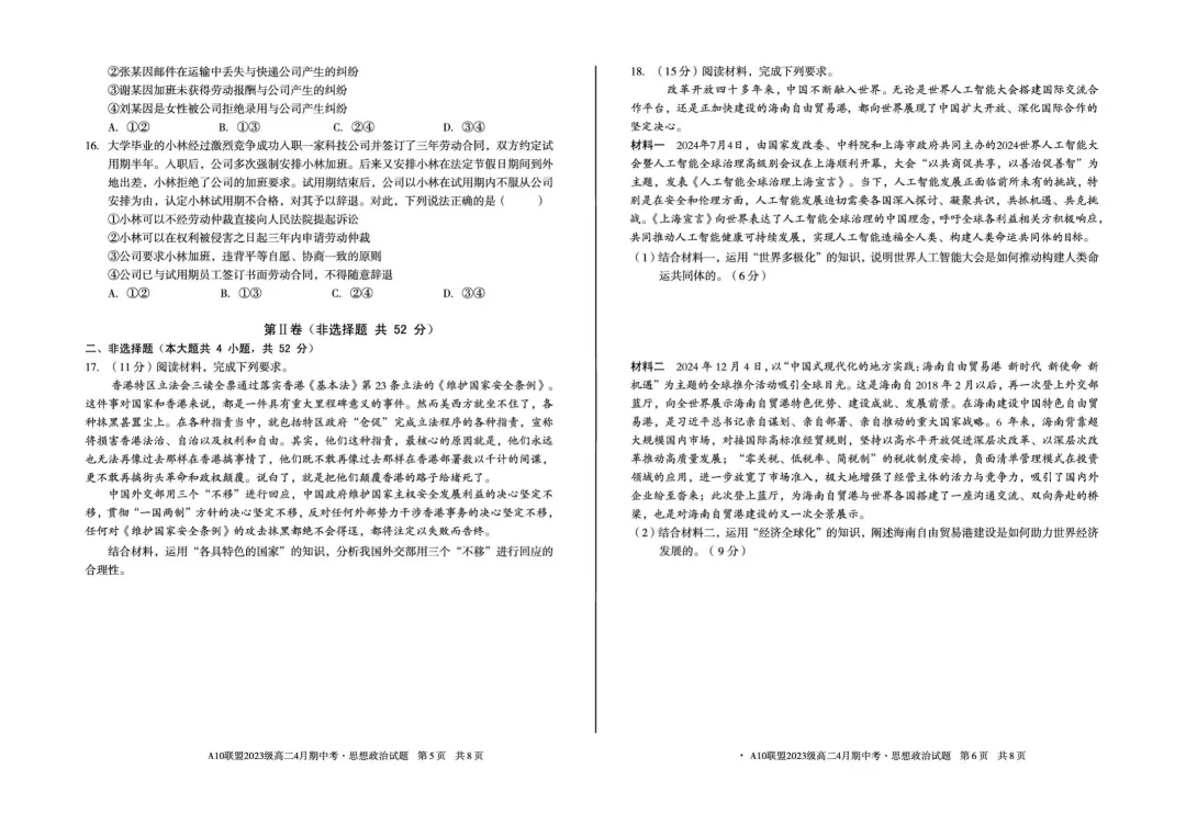 【可下载】安徽省A10联盟2024-2025学年高二下学期4月期中考试政治试卷(扫描版,含答案)