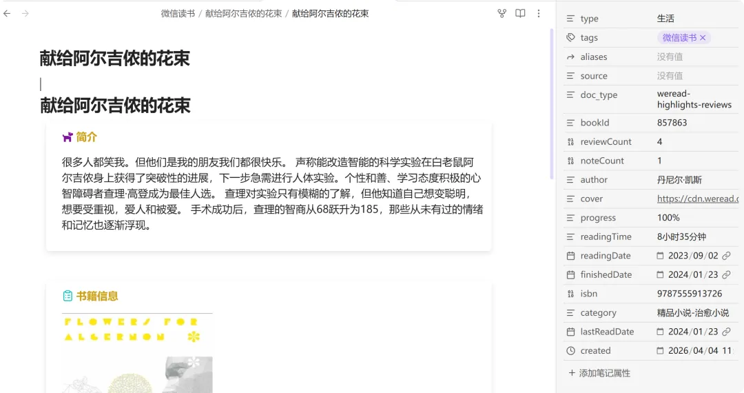 以之前分享的微信读书笔记文件为例,读书笔记导入过程中,系统会自动帮我们生成这本书的各方面信息,包括但不限于进度、作者、初次阅读日期、结束阅读日期等。