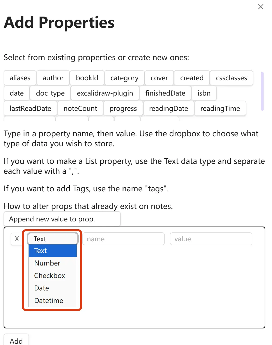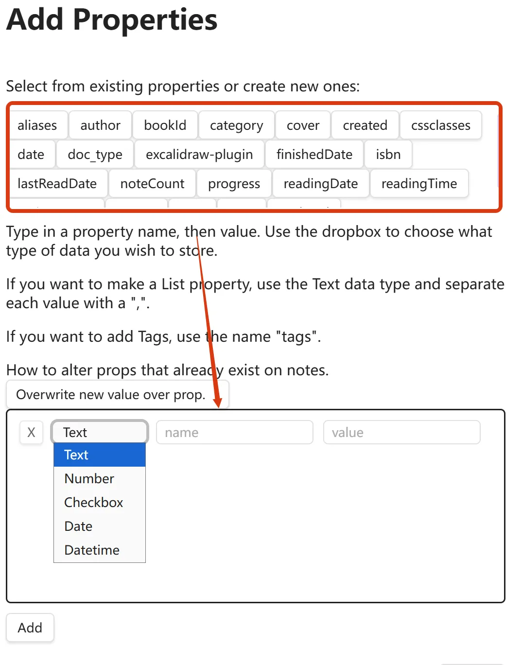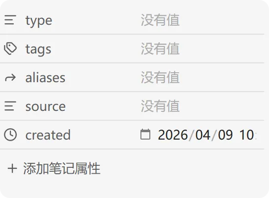 当然,我们一般的文件不会涉及到这么多的属性。我自己的话只添加了 5 个,Type(类别)、Tag(标签)、Aliases(别名)、Source(源链接)、Created(创建时间)