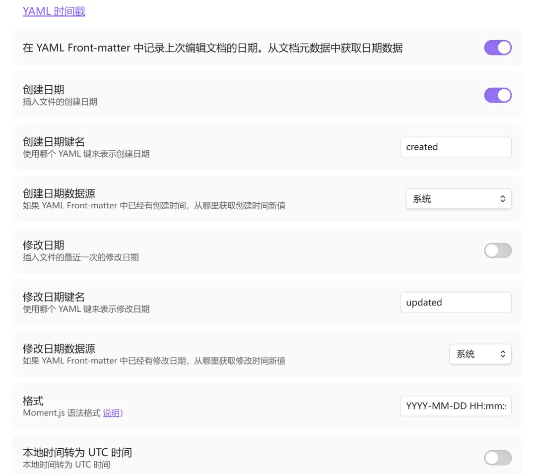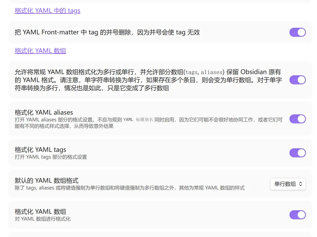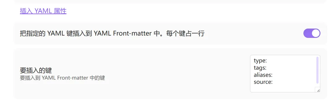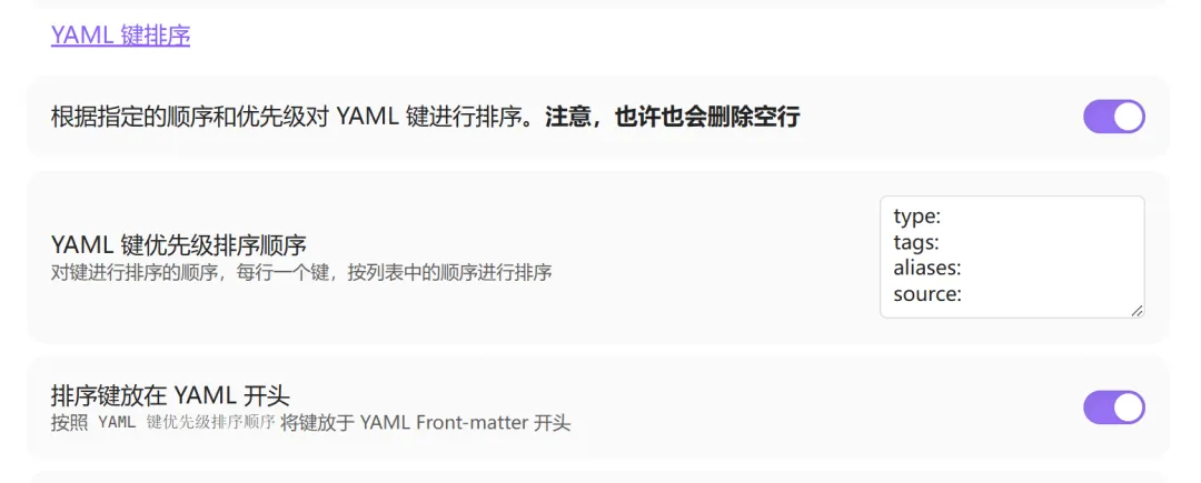 往下翻,找到“插入 YAML 属性”和“YAML 键排序”,这里是我自己设置的,你们也可以根据自己的需求设置不同的标签。