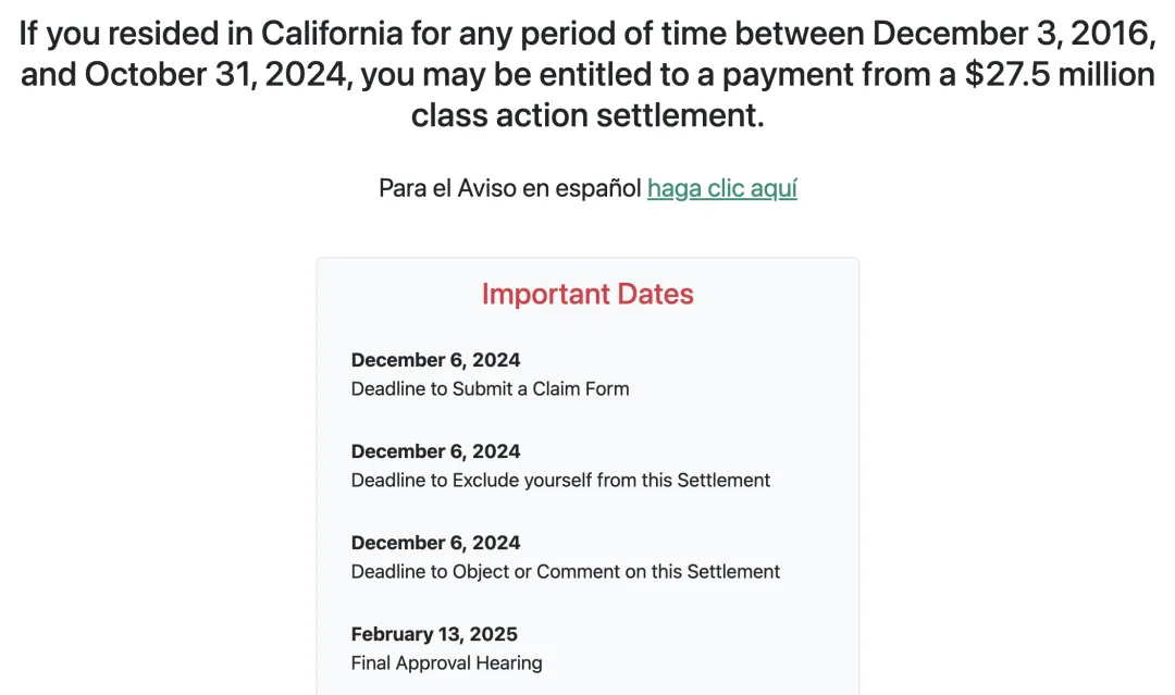 凡是在 2015.2.20到2015.11.10期间在加油站加油,并实际居住在洛杉矶,圣地亚哥,橙县,河滨,圣博纳迪诺,克恩,文图拉,圣巴巴拉,圣路易斯奥比斯波,伊梅里尔郡的居民,有资格获得一个集体诉讼的补偿。涉事的能源交易公司不承认有任何过错,但同意支付 5000 万美元和解。如果你符合条件,需要在 2025年1月10前提交索赔,有任何问题可以邮件联系classmemberinfo@CalGasLitigation.com