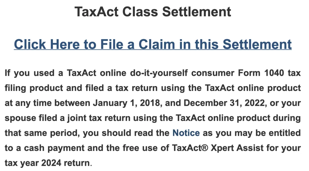 赔偿金与补偿服务:申请人提交有效索赔后,每人预计可得$18补偿,同时Taxact将向受影响用户提供一年免费的Taxact Xpert Assist服务(用于2024年度的报税)