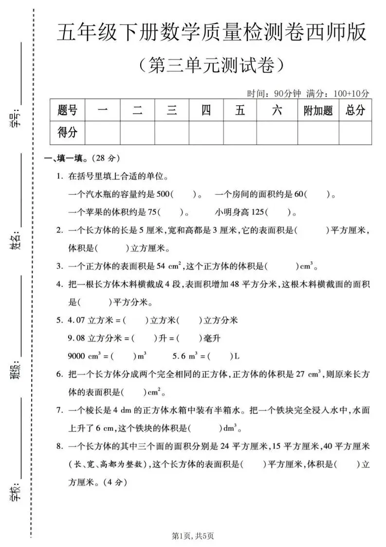 五年级数学第三单元测试卷来啦!(电子版可打印)