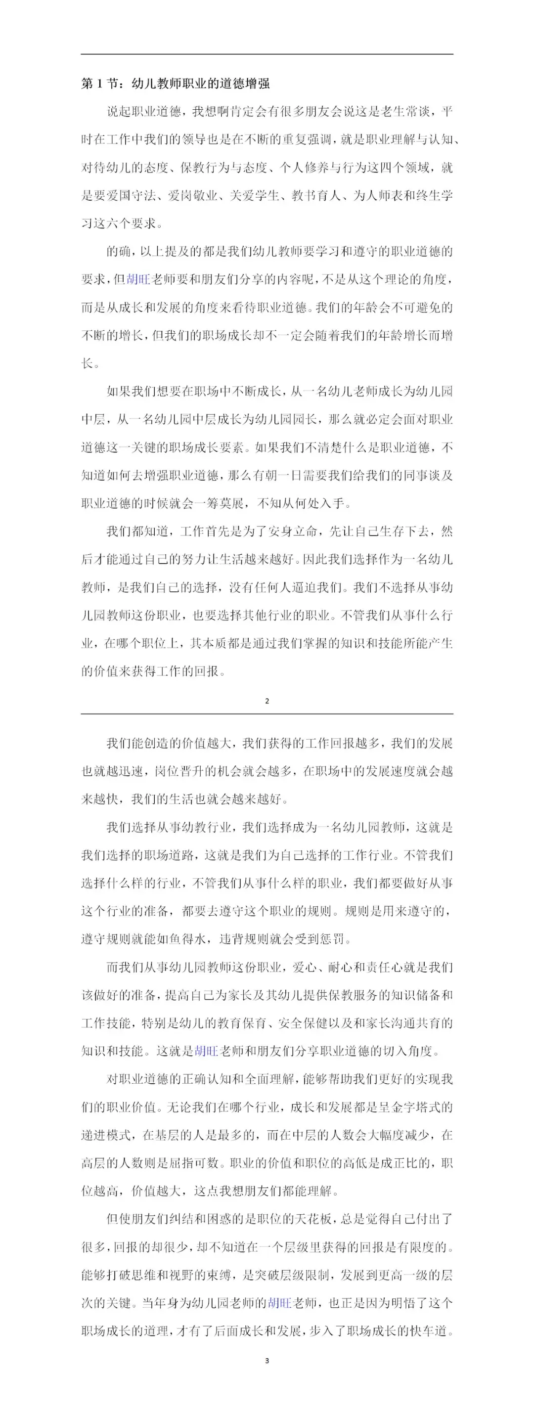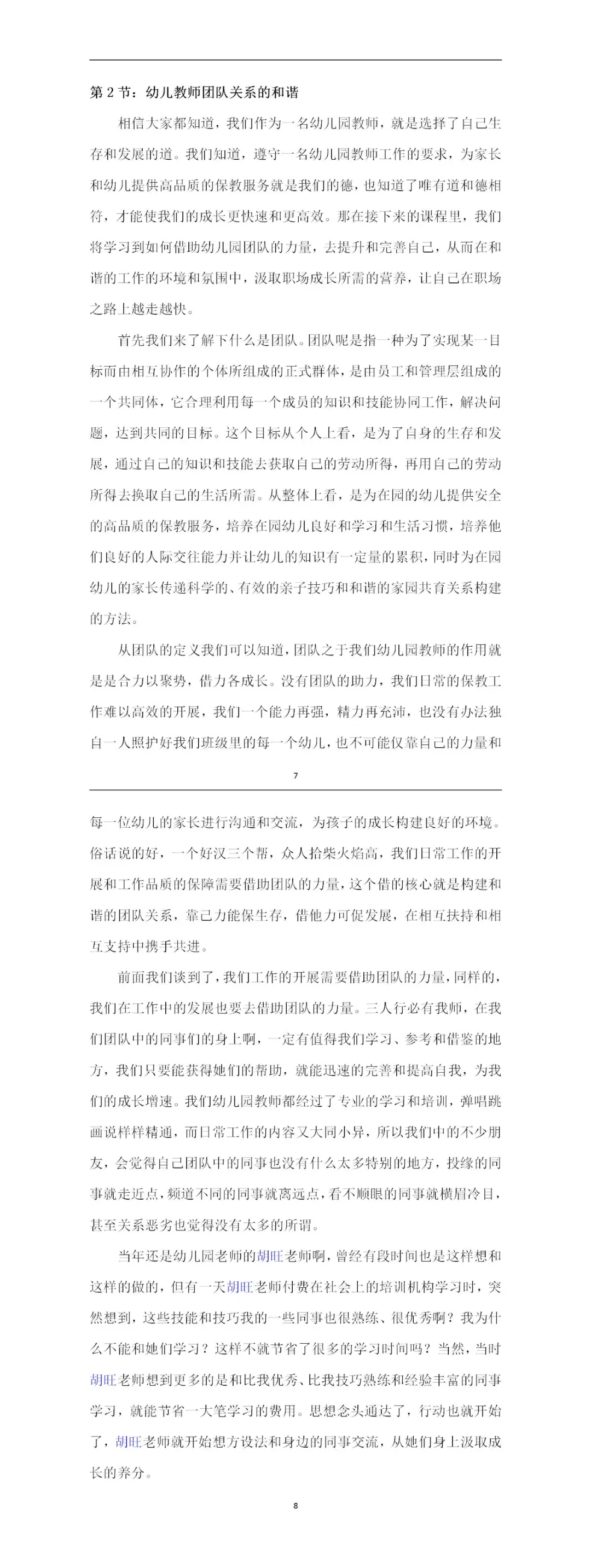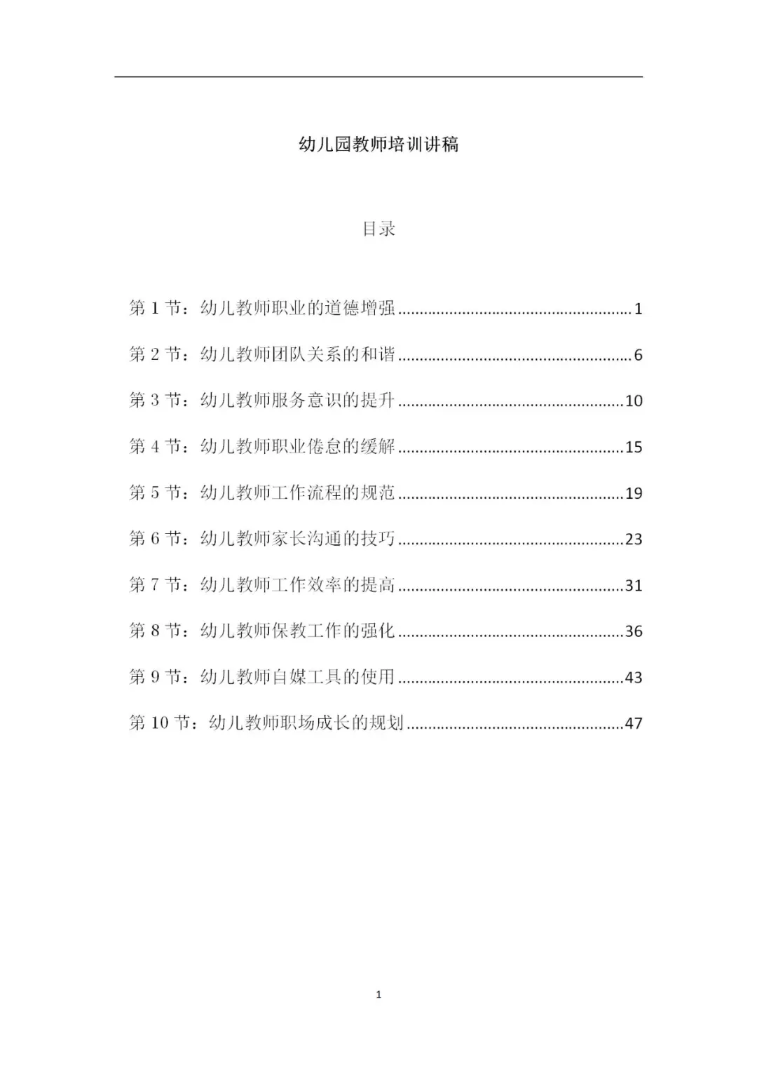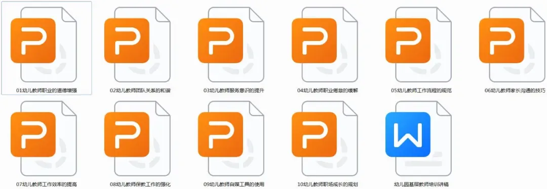 二、资料内容1、幼儿教师团队职业道德增强2、幼儿教师团队关系的和谐3、幼儿教师服务意识的提升4、幼儿教师职业倦怠的缓解5、幼儿教师工作流程的规范6、幼儿教师家长沟通的技巧7、幼儿教师工作效率的提高8、幼儿教师保教工作的强化9、幼儿教师自媒工具的使用10、幼儿教师职场成长的规划11、幼儿园基层教师培训讲稿*共计11个文档