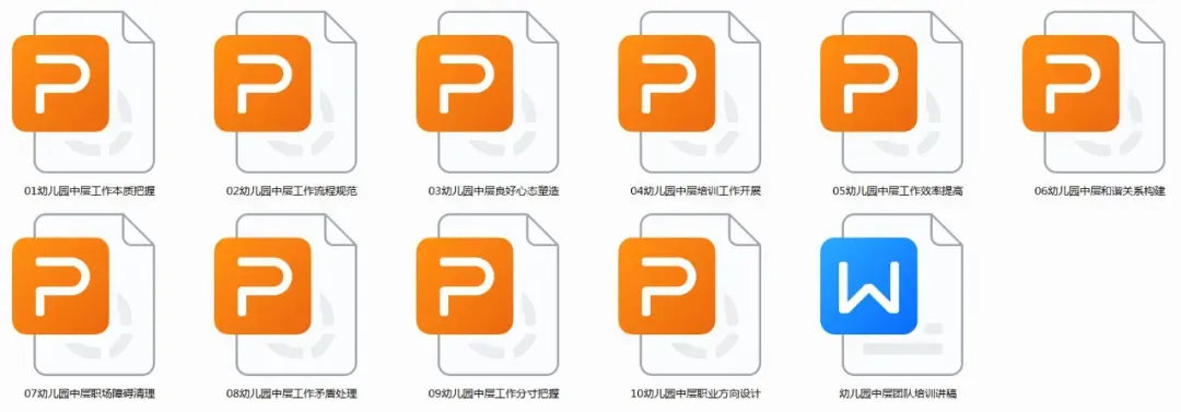 二、资料内容1、幼儿园中层工作本质把握2、幼儿园中层工作流程规范3、幼儿园中层良好心态塑造4、幼儿园中层培训工作开展5、幼儿园中层工作效率提高6、幼儿园中层和谐关系构建7、幼儿园中层职场障碍清理8、幼儿园中层工作矛盾处理9、幼儿园中层工作分寸把握10、幼儿园中层职业方向设计11、幼儿园中层团队培训讲稿*共计11个文档