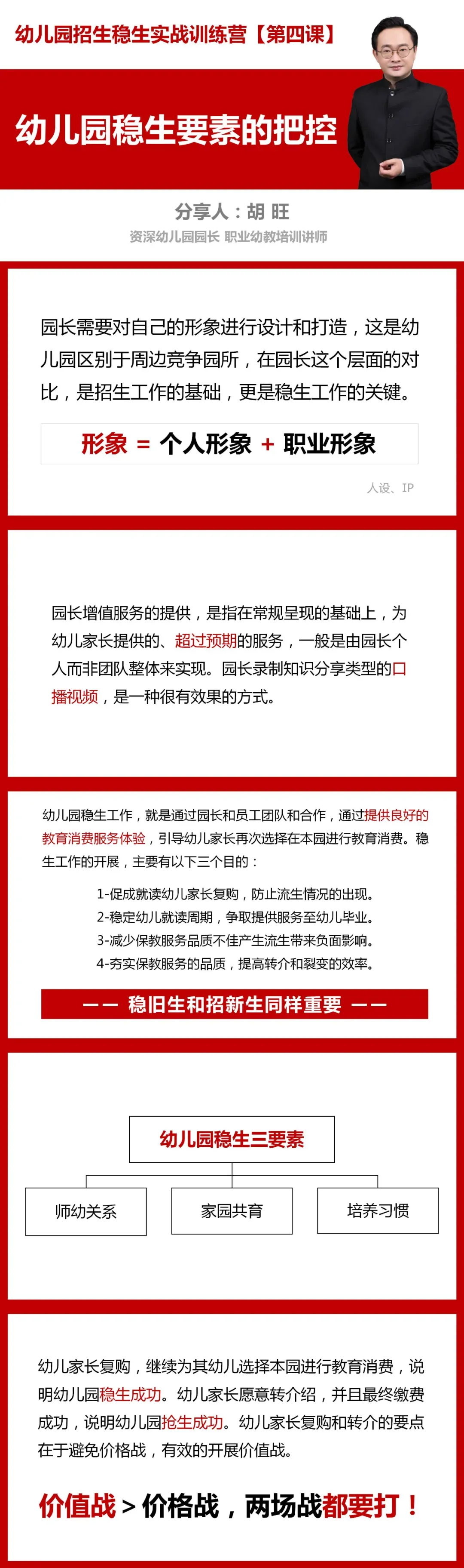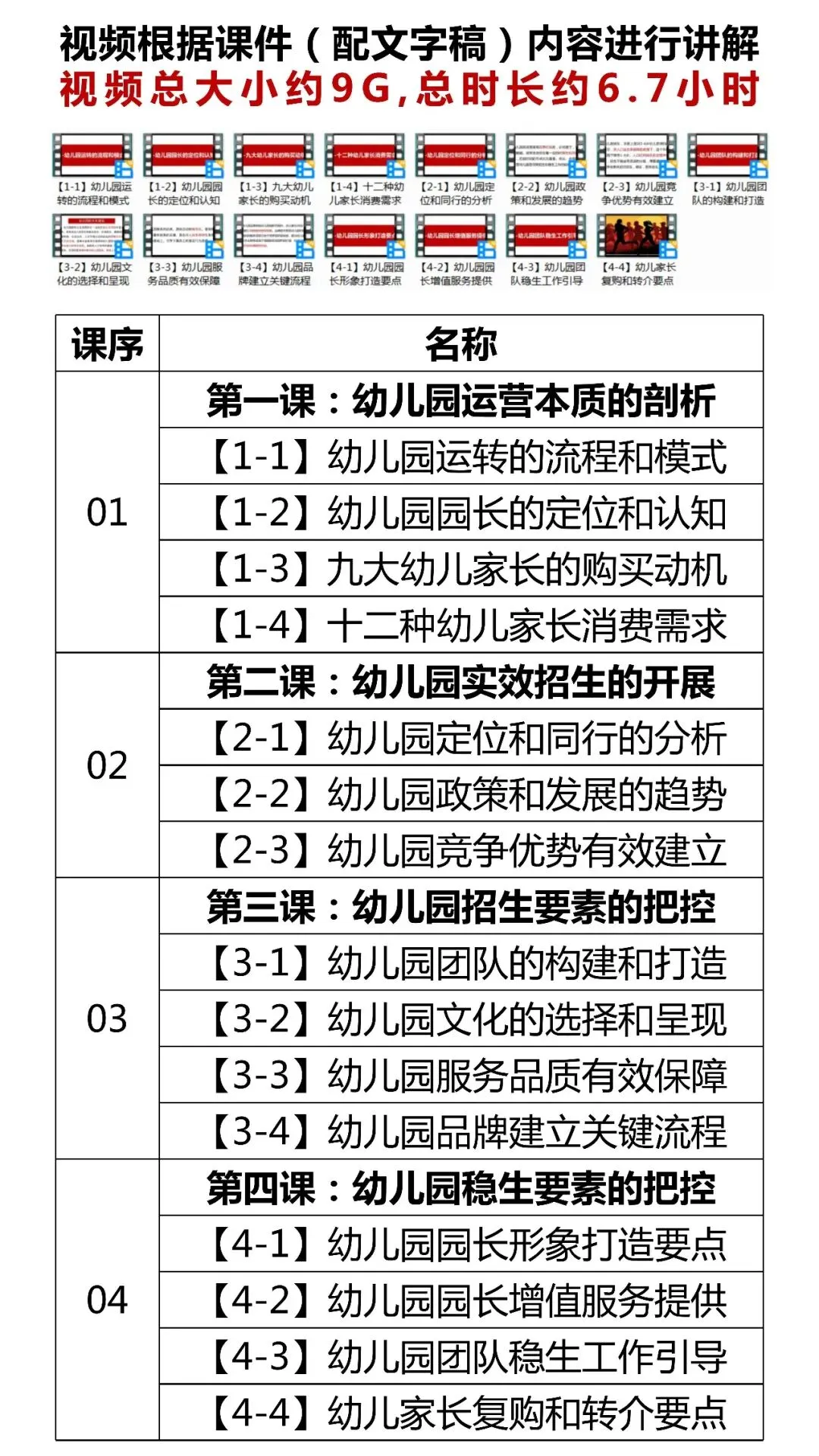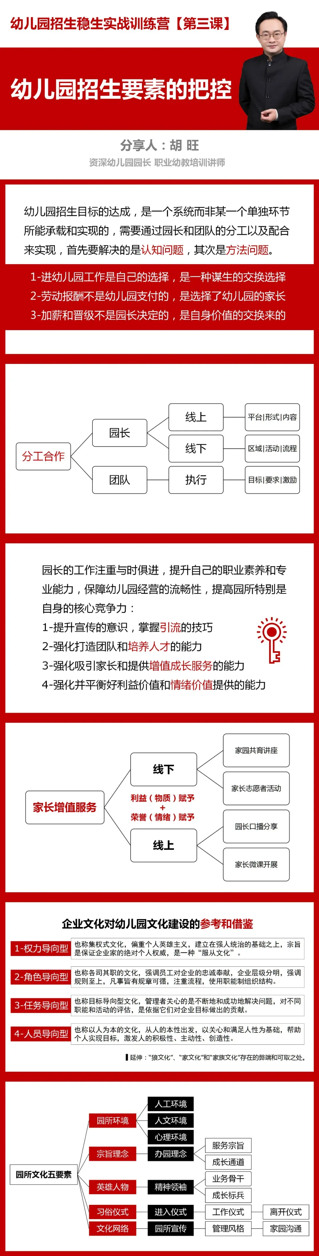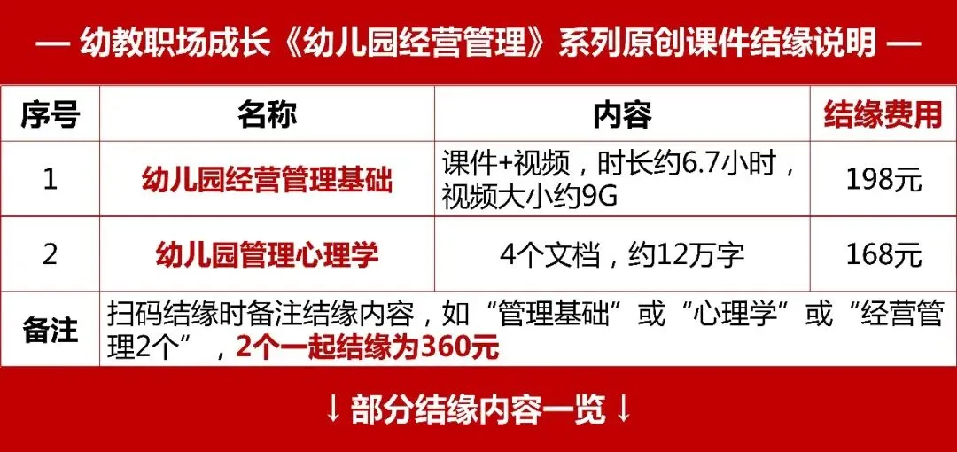 幼儿园经营管理系列资料结缘说明 幼儿园经营管理系列资料结缘说明 幼儿园经营管理学习资料 —— 幼儿园招生稳生训练营网课视频 —— 适用于幼儿园管理者职业化运营能力提升 【部分课件内容】 幼儿园管理心理学资料 —— 约12万字,源文件方便修改使用 —— 适用于幼儿园整体运营效果提升 【部分资料内容】