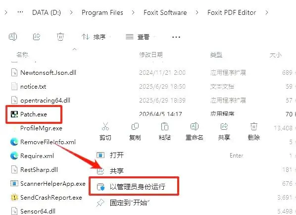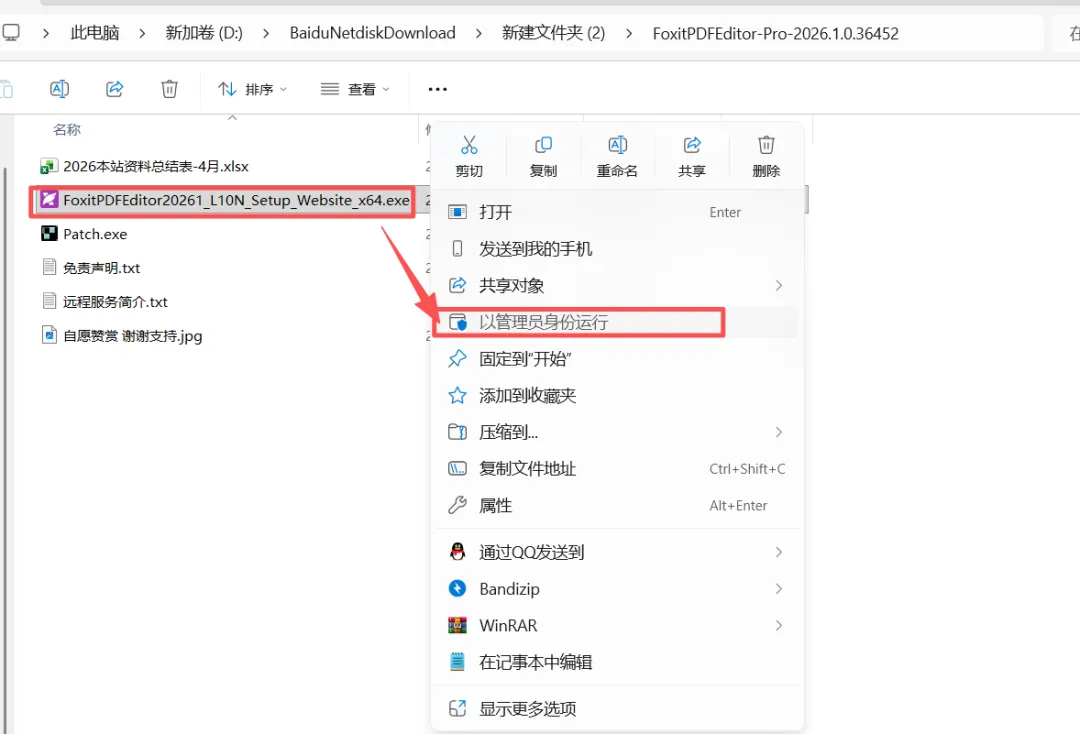 2.进入【FoxitPDFEditor-Pro-2026.1.0.36452】文件夹,以管理员身份运行【