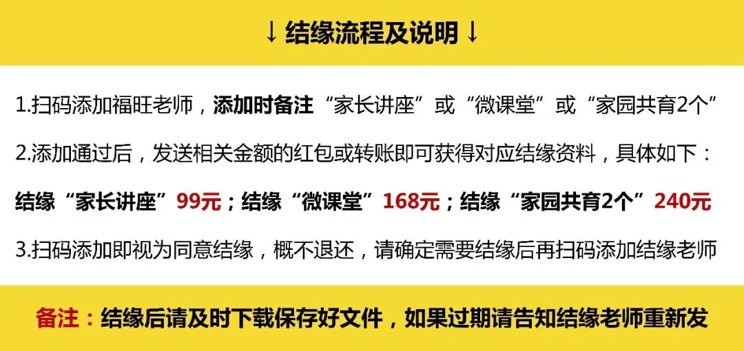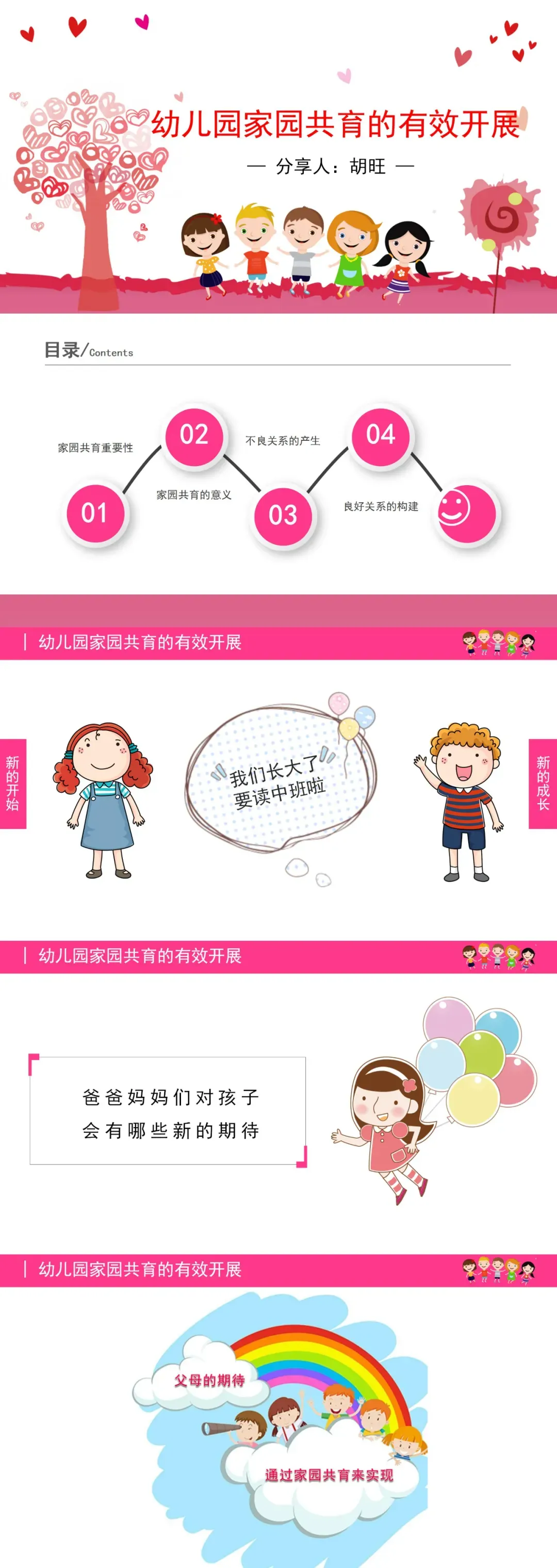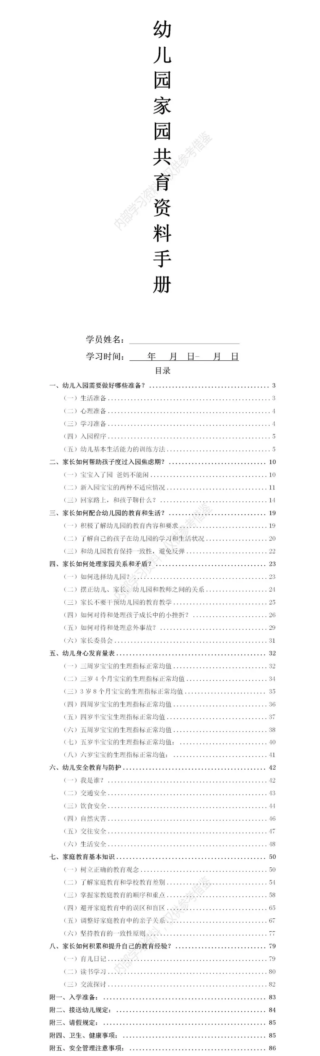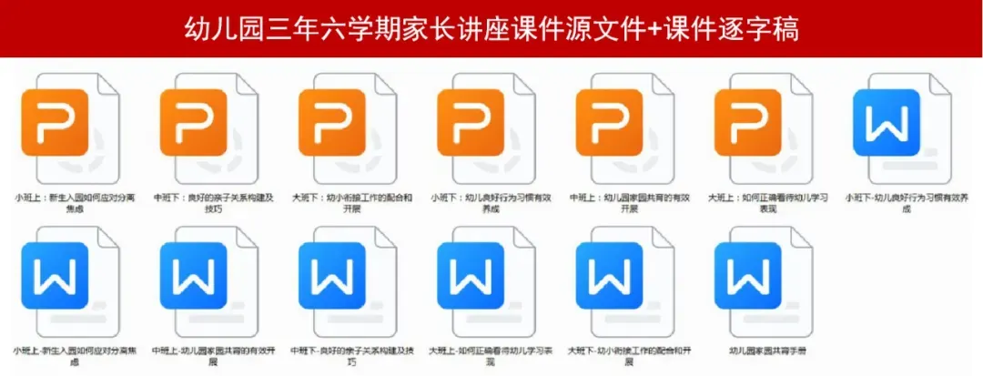 二、资料内容1、小班上:新生入园如何应对分离焦虑2、小班下:幼儿良好行为习惯有效养成3、中班上:幼儿园家园共育的有效开展4、中班下:良好的亲子关系构建及技巧5、大班上:如何正确看待幼儿学习表现6、大班下:幼小衔接工作的配合和开展7、幼儿园家园共育手册*共计13个文档