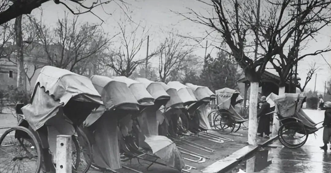 人力车夫,城里的老影子,照片上这排车撑起的布棚老远就认出来了,以前想省劲出门就坐这个,两根铁棍子一抬,客人往后一坐,人力车夫拿毛巾在脖子一别,步子迈开路就有了,胡同里、土路上都照跑不误,拉车的男人常年晒得脖子黑,背心一透气,脸上和手臂都是片片汗渍。