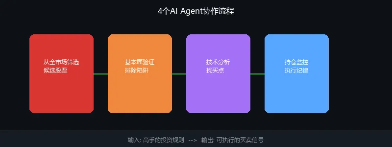 参考我的4 Agent模式:A1负责初筛,A2负责验证,A3负责择时,A4负责风控。不一定需要很复杂的AI,普通的数据分析工具加上明确的规则,就能搭出雏形。