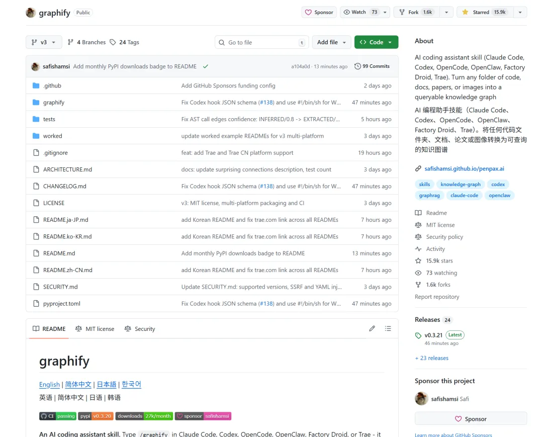 - Graphify v3 是一个 AI 编码助手 Skill,支持 Claude Code、Codex、OpenCode、OpenClaw、Trae、Factory Droid,把任意文件夹(代码 + 文档 + 图片)编译成持久化的知识图谱