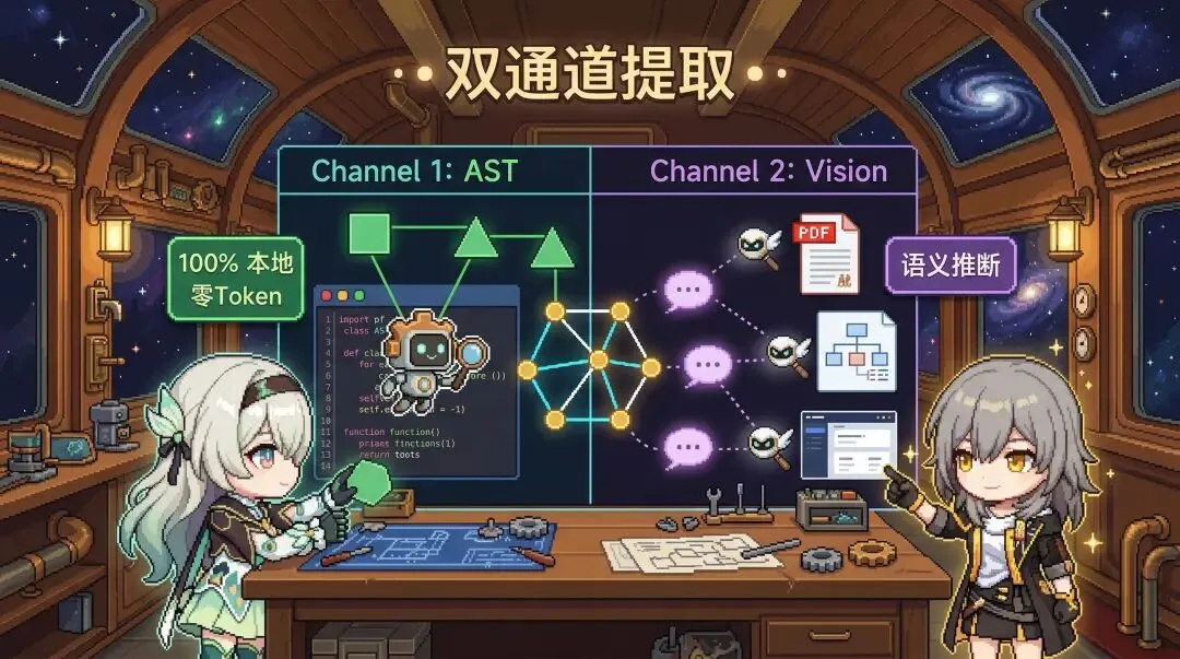 - 代码结构用 Tree-sitter 本地解析,不走 LLM,零 Token;文档和图片用 Claude Vision 子智能体并行提取,两条通道互不干扰