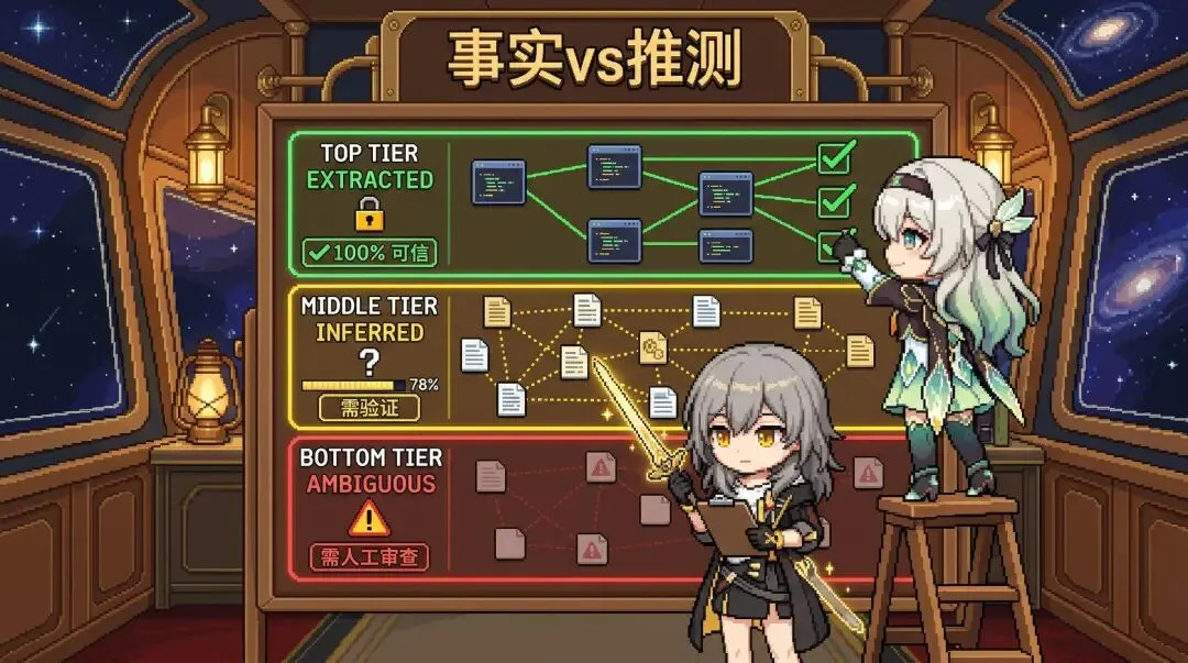 INFERRED。 来自 LLM 语义推断,概率假设,带置信度分数,用之前得验证。