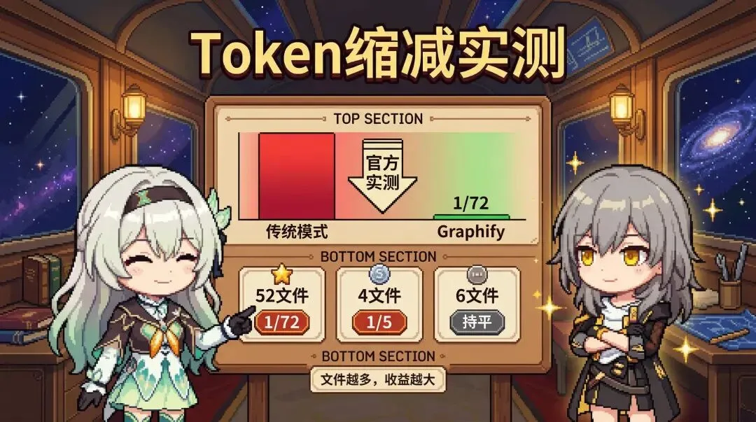 - 官方基准测试,52 个文件的混合语料库,Token 消耗降到原来的约 1/72。越复杂的项目收益越大,小项目降幅有限