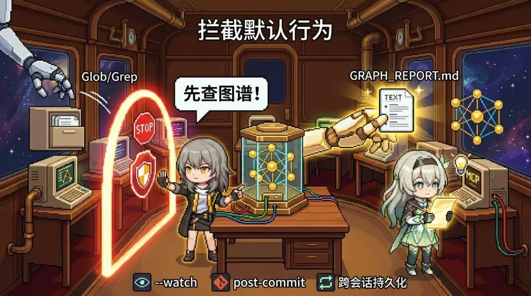 它在 AI 的工具调用链中装了拦截器。执行 graphify claude install 后做两件事:一是向 CLAUDE.md 注入行为契约,要求 AI 在回答架构问题前必须先读图谱报告;二是设置 PreToolUse 拦截器,每当 AI 试图调用 Glob 或 Grep,如果检测到已有图谱,会自动注入系统警告:”知识图谱已存在,先查图谱再搜原始文件。”